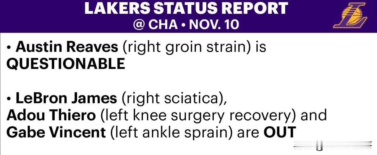 湖人vs黄蜂伤病报告公布!!!克莱伯完全康复,里夫斯出战状态升级! 北京时间11月11日,也就是双11当天,湖人将继续客场挑战黄蜂队,黄蜂目前排在东部倒数第四,也算一个弱旅,湖人是否有机会呢? 目前,湖人刚刚公布了本场比赛的伤病报告,对湖人来说算是一个好消息,首先长期病号克莱伯完全恢复健康,他已经彻底从伤病名单消失,而里夫斯也有好转,他的状态从缺阵升级为出战成疑,这就表示里夫斯这场比赛可能会打,当然也可能到打雷霆再复出。 昨天主教练雷迪克也说过,里夫斯会在客场之旅的某一个时点复出,只是目前还不确定;詹姆斯和文森特、蒂耶罗三人仍然打不了。 黄蜂队也不容轻视,最近他们的几个新秀表现不错,投篮准得很,打湖人应该会很来劲! 湖人队里夫斯 里夫斯 湖人阵容名单 湖人阵容 湖人伤病 湖人队内动态