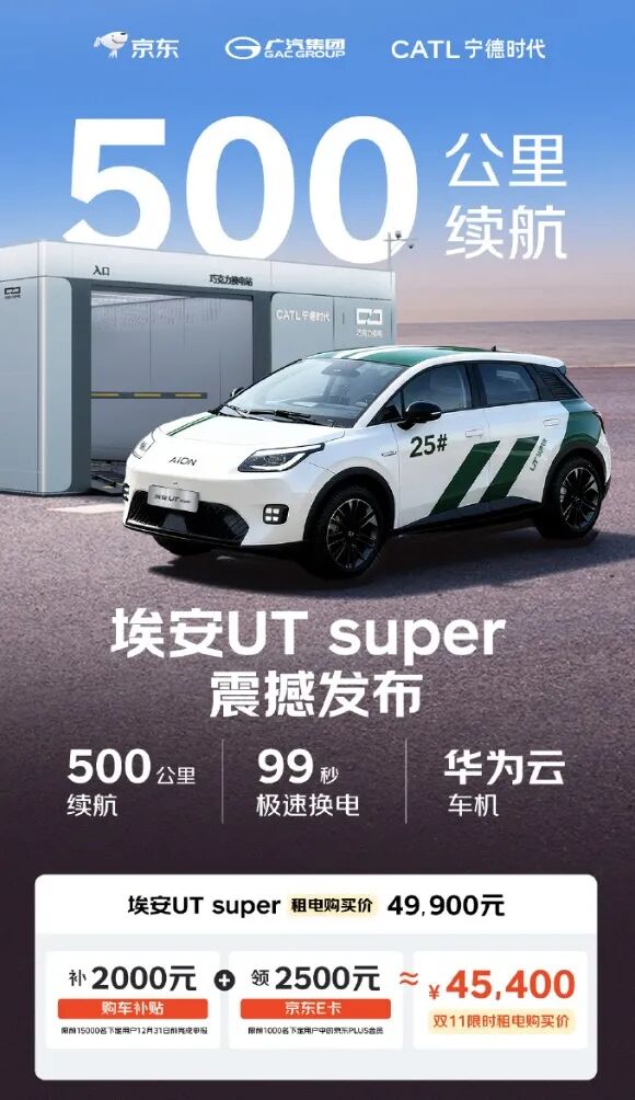 据埃安AION官微消息,由京东、广汽、宁德时代联合推出的埃安UTsuper国民好车正式官宣价格,电池租用价4.99万元,叠加汽车补贴及京东E卡补贴PLUS会员最低可至4.54万元。