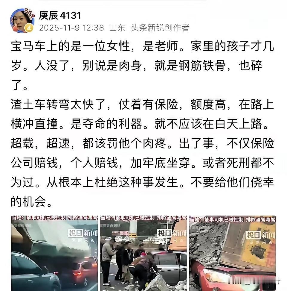 飞来横祸,躺着也中枪。 烟台一女子,据悉是一名教师,孩子还小,才几岁大。 那天开着红色宝马正常行驶,怎么也想不到,一场灭顶之灾会突然降临。 身旁的渣土车毫无征兆地侧翻,生死就在一瞬间。她下意识向右猛打方向盘,可前后都被车辆紧紧卡住,根本没有躲闪的空隙。下一秒,渣土车的翻斗就狠狠砸了下来,满车的石头瞬间将她的车砸得面目全非,这位妈妈再也没能回家,只留下年幼的孩子和满心悲痛的家人。 事后不少网友说,当时要是提速或者追尾前车就能躲过一劫。这话听着实在刺耳,纯属站着说话不腰疼。那种千钧一发的时刻,大脑早被巨大的恐惧笼罩,所有反应都是本能驱使,谁能像事后那样冷静盘算最优解?换作任何一个普通人,大概率都是同样的选择。 这事儿根本不是单纯的运气差,而是给所有车主提了个血的醒!大家总把远离大车当耳旁风,开车时要么图快和大车并排,要么跟车太近抢道。可大车的盲区大到超乎想象,车身重导致侧翻风险极高,和它们近距离相处,简直就是把自己放在危险边缘。 我们总随口说珍惜当下,可珍惜生命得落实在每一次出行里。不与大车长时间并行、保持足够安全距离、不抢行加塞,这些看似不起眼的小事,都是用血泪换来的保命准则。 谁都想平平安安回到家人身边,你开车时还有哪些避险小技巧?