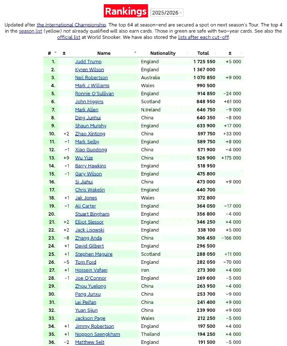 最新斯诺克世界排名来了,吴宜泽成为最大的赢家,跻身世界前16又多了几个红包赛参赛机会,英锦赛世锦赛直接参加正赛。 凭借国锦赛冠军收获的17.5万英镑,吴宜泽上升至第13,此次国锦赛四强赵心童第10。特囧萝名列123、马火希75三杰仍然位居456。 前16仍然保持5位中国选手:丁俊晖第8、肖国栋第12、斯佳辉第16。2023年国锦赛冠军张安达扣掉奖金后跌出前16,下滑到第23位。