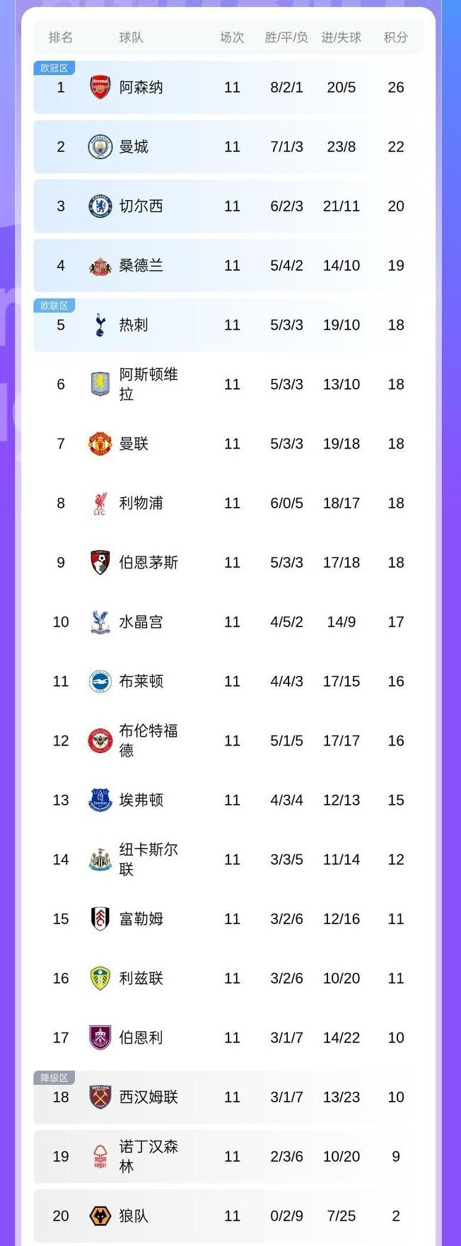 英超第11轮,利物浦0-3曼城!利物浦攻防两端问题太多。球队恢复元气还需要时间,但阿森纳和曼城已经两骑绝尘了。 阿森纳赛季不败甩开曼城4分。利物浦名次已远离欧冠区,居然排在曼联后面。 降级区除了狼队输球,铁锤帮森林队都在主场赢球,利兹联又输了,看来是奔着降级去的。