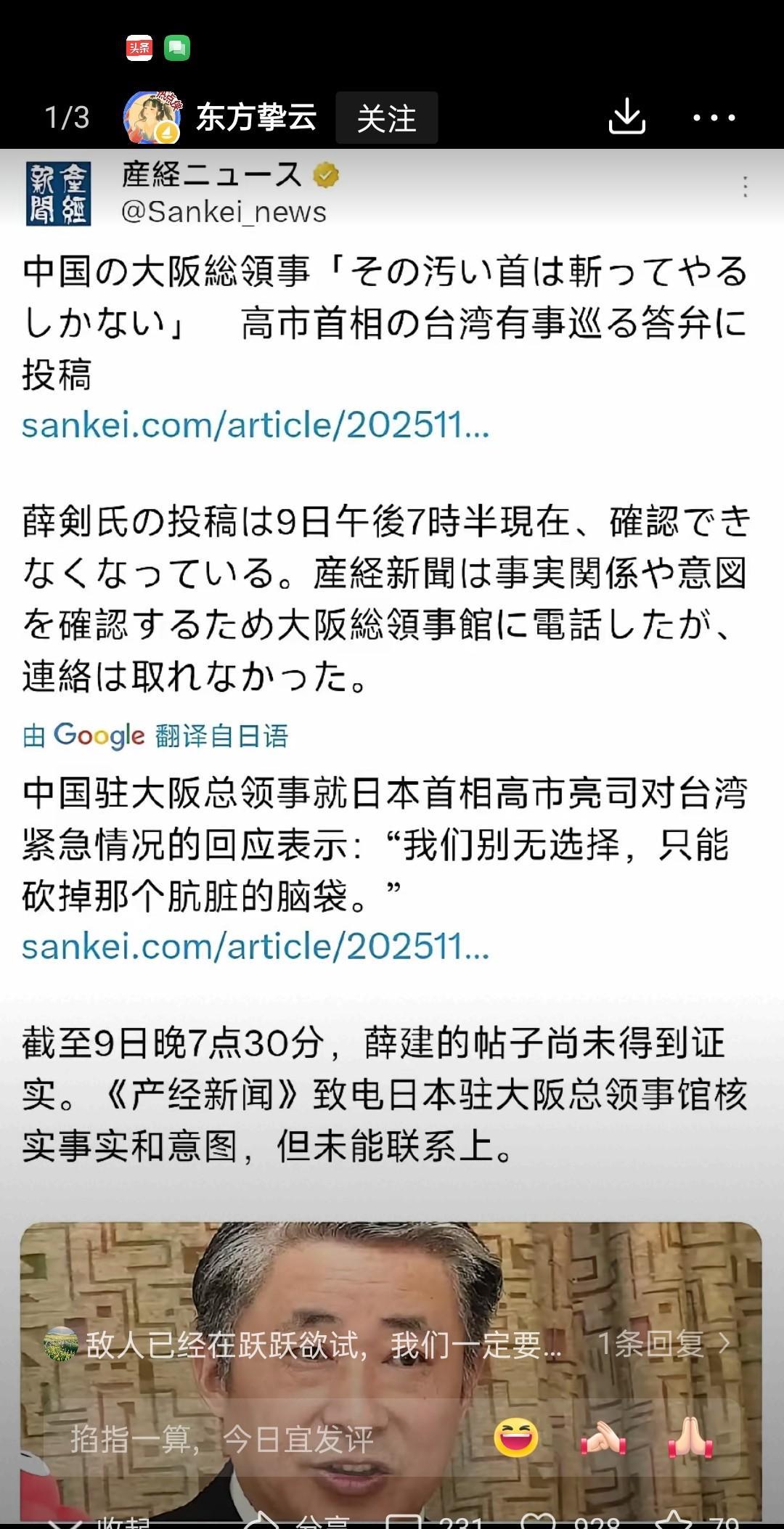 霸气!中国对日本不再克制,发出了清算强音! 日本首相高市早苗继续作妖,竟然妄称“台湾有事”而可能动用武力后,中国对日本高市早苗政府不再克制,我们驻大阪总领事薛剑先生迅速在日本发起了反击,他在转发了相关新闻之后,在后面加上了评论:“擅自伸过来的肮脏脑袋,只能毫不犹豫地砍掉。你做好觉悟了吗!”相信薛剑领事这句霸气侧漏的宣言,说到了每一个爱国者的心坎上,因为大家都知道,三千多万人的血海深仇,既然得不到作恶者们的一声真诚道歉和忏悔,那么,唯一能做的就是用以牙还牙的方式来洗刷耻辱。广大网友们早已说过,伟人不接受日本人的战争赔偿,就是用不放过的态度将血债血偿的机会留给子孙后代。幸运的是,经过70多年的奋发图强,我们终于具有了清算强盗的实力。可以说,此时此刻高市早苗如此挑衅,正合我意,一句直指敌酋脑袋的强音迸发,合情合理又解气!80多年了,我们终于可以对日本不再克制,喊出了压抑在国人几代人心中清算日本的呐喊,太解恨了。有理由相信,每一个爱国者都支持薜剑领事,更支持相关的行动!若有召,必响应!
