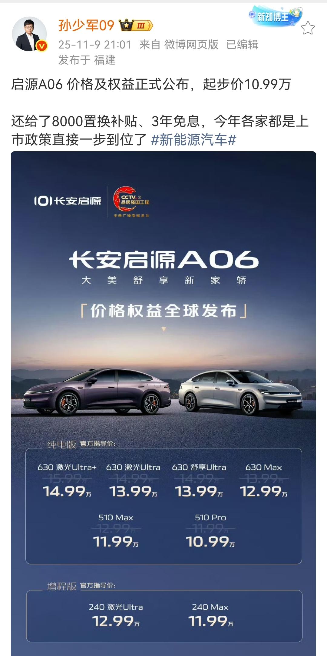 孙少军:启源A06 价格及权益正式公布,起步价10.99万! 还给了8000置换补贴、3年免息,今年以来各厂家给的优惠幅度都是相当的大,年底是拼销量的好机会,接下来还有一个多月的时间,能多交付出去一辆,对于企业来说就离目标又近了一步。 长安汽车推出的两个新能源子品牌,一个是深蓝,另一个是启源,卖的都挺不错的。各位是怎么看的?欢迎评论区留言。