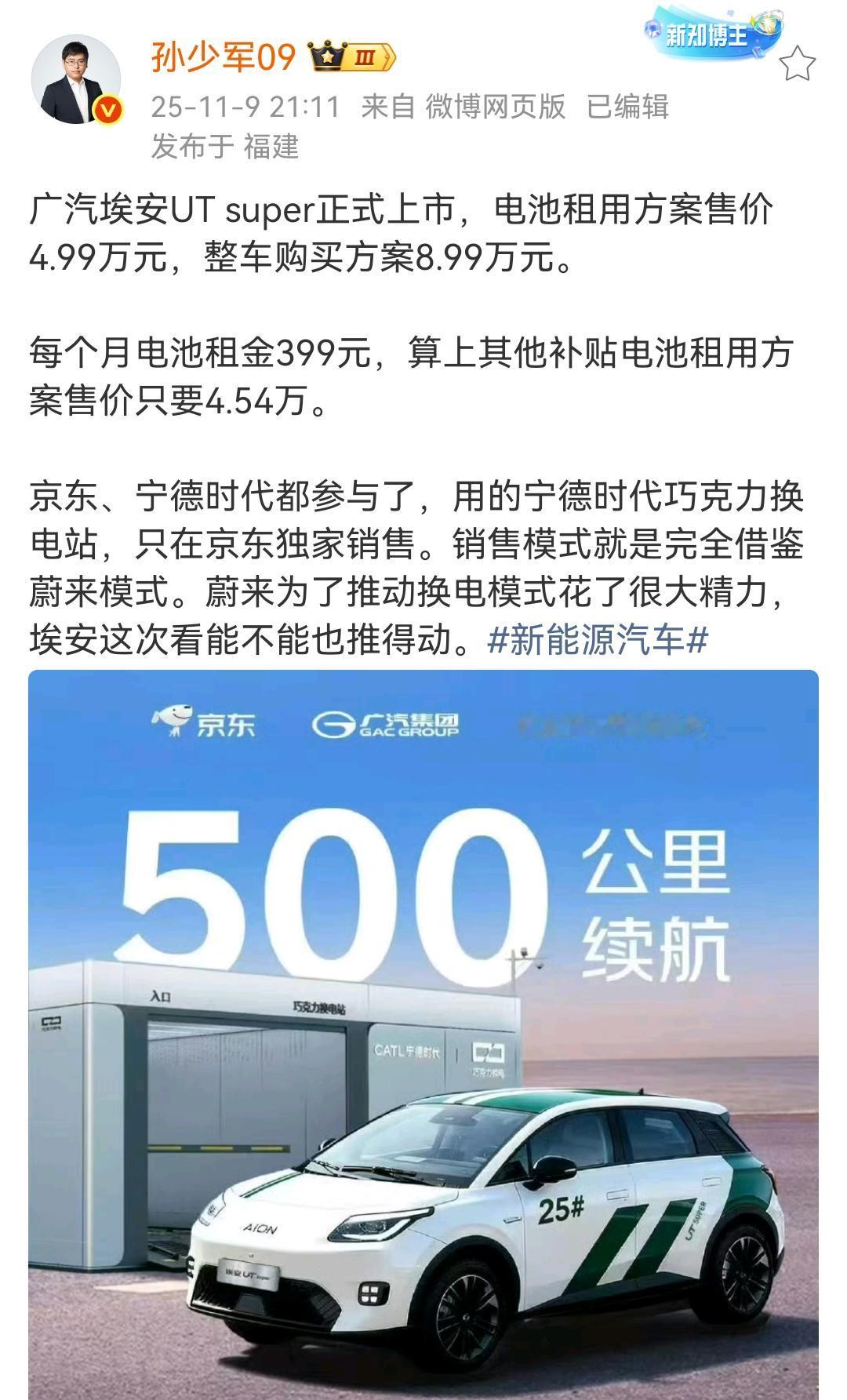 孙少军:蔚来的换电模式得到行业巨头宁德时代的认可! 广汽埃安UT super正式上市,电池租用方案售价4.99万元,整车购买方案8.99万元。 这是三方合作的车辆,由京东进行独家销售,广汽集团负责制造,宁德时代负责电池租赁业务与换电业务。 租电的好处是显著的降低购置的成本,直接将成本削减了一半,剩下来的4万块钱相当于按月去交电池的租金。消费者再也不用担心电池衰减了因为是租赁的,如果觉得这块电池不好用就去换一块。 各位是怎么看的?欢迎评论区留言。