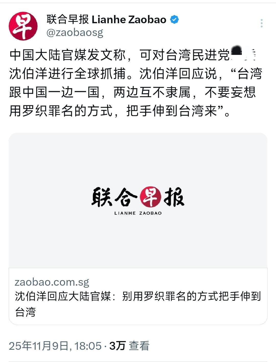 新加坡联合早报(11月9日晚)报道:“中国大陆官媒发文称,可对台湾民进党民代沈伯洋进行全球抓捕。沈伯洋回应说,‘台湾跟中国一边一国,两边互不隶属,不要妄想用罗织罪名的方式,把手伸到台湾来’。” 2021年,他以台北大学犯罪学研究所所长身份,在台湾创立“黑熊学院”,表面是民间组织,实则被国台办定性为“台独基地”。 该机构打着“防卫台湾”的幌子,散布“大陆将在某年某月武统台湾”的虚假信息,甚至扬言要在三年内训练300万名“黑熊勇士”。 这些言论不仅煽动两岸对立,更在台湾青少年群体中埋下暴力冲突的种子。更恶劣的是,他长期将“大陆配偶”群体污名化为“间谍”,导致多名大陆母亲被迫与台湾丈夫、年幼子女分离,家庭支离破碎。 沈伯洋的“台独”生意并非孤立存在。公开资料显示,其创办的组织曾接受美国国际开发署约135万美元资助,成为外部势力干预台湾政治的棋子。 他一边利用“学术”身份包装自己,一边与民进党当局勾结,通过“立委”职位推动实质性“台独”议程。讽刺的是,他的父亲沈土城在深圳经营兆亿公司,长期从事大陆商品转口贸易,将中国制造的低买高卖至厄瓜多尔等地,家族企业赚得盆满钵满。 这种“端起碗吃饭,放下碗骂娘”的行径,连岛内媒体都看不下去,多次讽刺其“靠大陆政策发财,转头煽动台独”。 2025年10月28日,重庆市公安局以“分裂国家罪”对沈伯洋立案侦查,彻底撕下他的伪装。警方透露,已收到大量举报线索,涉及沈伯洋通过“黑熊学院”系统培育暴力分子、接受境外资金干预台湾政治等核心证据。 法律程序启动后,沈伯洋的“末日恐惧”逐渐显现——他先是辩称自己从事“学术研究”,随后又抛出“一边一国”的谬论,试图将个人行为与台湾民众捆绑,但这种垂死挣扎反而暴露其色厉内荏的本质。 大陆对“台独”分子的追责并非一时兴起。2024年出台的《关于依法惩治“台独”顽固分子分裂国家、煸动分裂国家犯罪的意见》明确,对“台独”分子可采取刑事追责、缺席审判等措施,并可依法通缉、引渡。 中国人民大学法学院教授程雷指出,沈伯洋案具有特殊性,一旦证据确凿发布通缉令,国际刑警组织的“红色通报”将成为全球追捕的法律依据。 通过国际刑事司法协助、警务联合行动等机制,中国已成功将多名境外潜逃犯罪嫌疑人缉拿归案,沈伯洋的“避罪天堂”幻想注定破灭。 民进党当局对此事的反应耐人寻味。赖清德上台后,岛内经济、能源问题积重难返,两岸关系僵局更成为悬在头顶的达摩克利斯之剑。若为沈伯洋与大陆高强度对抗,可能打破其刻意维持的“脆弱平衡”。因此,民进党虽表面声援沈伯洋,实则不敢过度炒作,暴露出“台独”势力外强中干的本质。 沈伯洋的案例折射出“台独”分子的共同逻辑:以学术、民间组织为掩护,通过煽动仇恨、制造对立谋取私利,最终沦为外部势力的工具。他们的行为不仅破坏两岸关系,更将台湾推向危险边缘。 数据显示,183个与中国建交的国家均支持一个中国原则,国际社会对“台独”的容忍度持续降低。大陆依法追责“台独”分子,既是对国家主权的捍卫,也是对台湾民众的保护——只有铲除这些毒瘤,才能让两岸关系回归和平发展的正轨。 如今,沈伯洋的“台独”剧本已接近终章。他的挣扎、辩解与恐吓,在法律与事实面前显得苍白无力。这场全球追捕的较量,不仅关乎个人命运,更将决定“台独”势力的最终结局。当法律利剑出鞘,任何分裂国家的行径都必将付出代价。