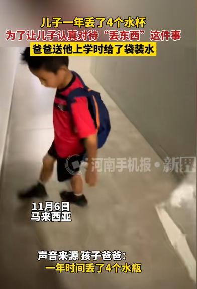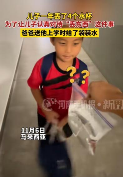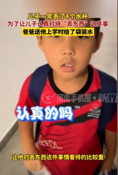 “笑不活了!”一小男孩上学频繁丢水杯,弄丢4个水杯后小男孩的爸爸终于忍不了了,最终爸爸做了一个决定,不给儿子买水杯了,直接拿一个袋子装好水给他带去学校。 赵先生的儿子今年刚上一年级,活泼好动的性格让“保管物品”成了难题。 入学第一天,孩子背着崭新的书包,手里攥着特意挑选的奥特曼吸管杯,蹦蹦跳跳地走进校园。 可谁能想到,这个贴了姓名贴的杯子,只陪伴了他三天,周三放学,孩子低着头告诉爸爸,杯子落在操场,回去找时已经不见了。 刚入学可能不适应,慢慢就好了,赵先生安慰自己,又买了一个口碑好的防摔保温杯。 这次他格外细心,在杯身刻上孩子的名字,杯底粘了迷你定位贴,还反复叮嘱孩子“喝完水就放进书包侧兜”。 接下来的两个月,赵先生又换了两个杯子:朴素无装饰的塑料杯,孩子用了半个月,在美术课后忘记带回教室。 带醒目红绳的运动壶,因为放学时追着同学跑,随手放在花坛边就忘了拿。 当孩子举着空书包说“对不起爸爸,杯子又丢了”时,赵先生看着孩子泛红的眼眶,既心疼又疲惫。 试过讲道理,告诉孩子“自己的东西要负责”;试过定奖励,承诺“用到期末就买遥控汽车”;甚至试过让孩子自己找杯子,可这些方法要么被孩子当成耳旁风,要么让他越发抵触。 第四个杯子丢失的当晚,赵先生翻看着手机里的购杯记录,突然萌生了一个念头:与其反复补救,不如让孩子亲身体验后果。 除此之外,还用红绳子在袋口绕了三圈系紧,递到孩子手里,这是你今天的水杯,丢了就没有新的了,得自己想办法喝水。 孩子带水袋上学的场景,被校门口的老师拍了下来,照片里,小男孩把水袋紧紧夹在胳膊下,走路放慢了脚步,生怕不小心洒出来。 据老师说,当天课间,同学们围着他的水袋好奇讨论,有人说“这个杯子不用怕丢”,有人问“会不会漏到书包里”,没有一个人嘲笑他。 看到他把塑料袋递过来的那一刻,我就知道这招没白试,赵先生说,从那以后,孩子喝水时总会下意识检查水杯,放学前会主动摸一摸书包侧兜。 这个看似简陋的塑料袋,装的不仅是温水,更是一份沉甸甸的成长礼物,在物质丰裕的当下,很多孩子习惯了“想要就有”,却忽略了物品背后的劳动与付出。 育儿路上,没有放之四海而皆准的公式,却有最真挚的用心。 赵先生的故事告诉我们,教育不是“硬刚”,而是“巧引”;不是替孩子收拾烂摊子,而是让他们学会自己承担。 当孩子从小懂得珍惜物品、对自己的行为负责,长大后才能更好地把握机会、守护信任。 那个提着塑料袋上学的小男孩,或许还不懂“责任”的深刻含义,但这次特别的经历,一定会在他心里埋下一颗种子,在未来的日子里生根发芽。