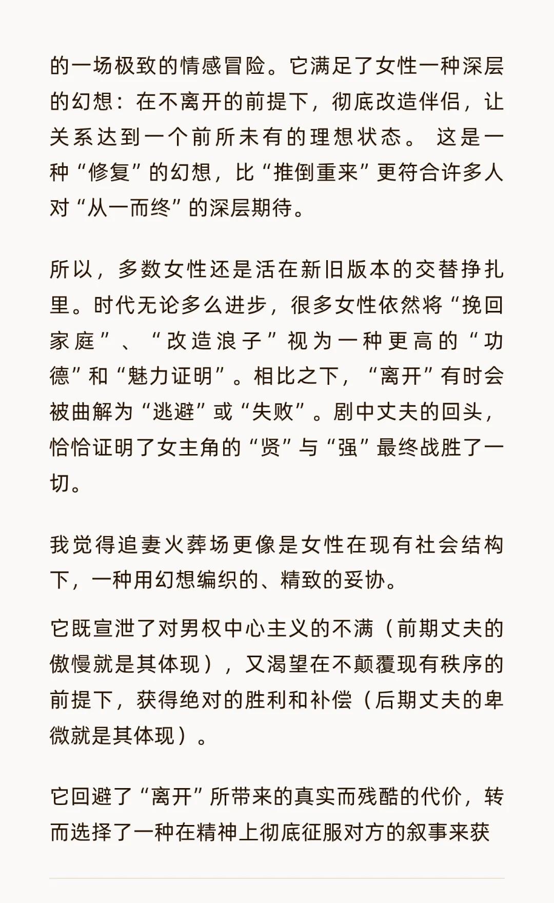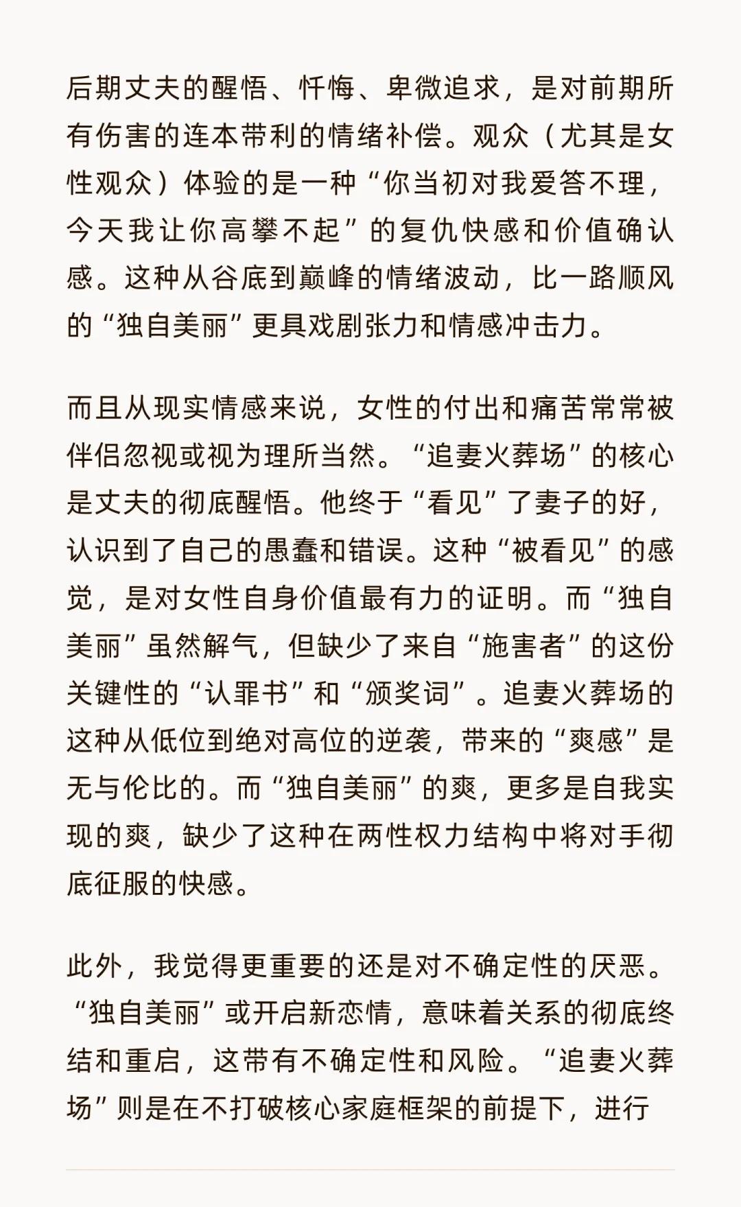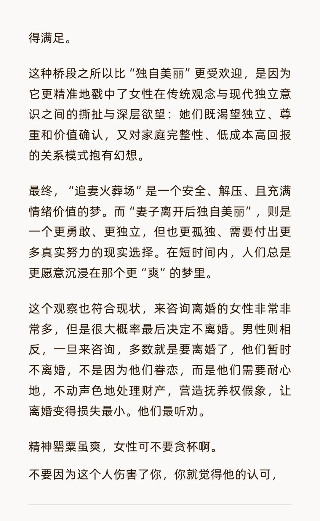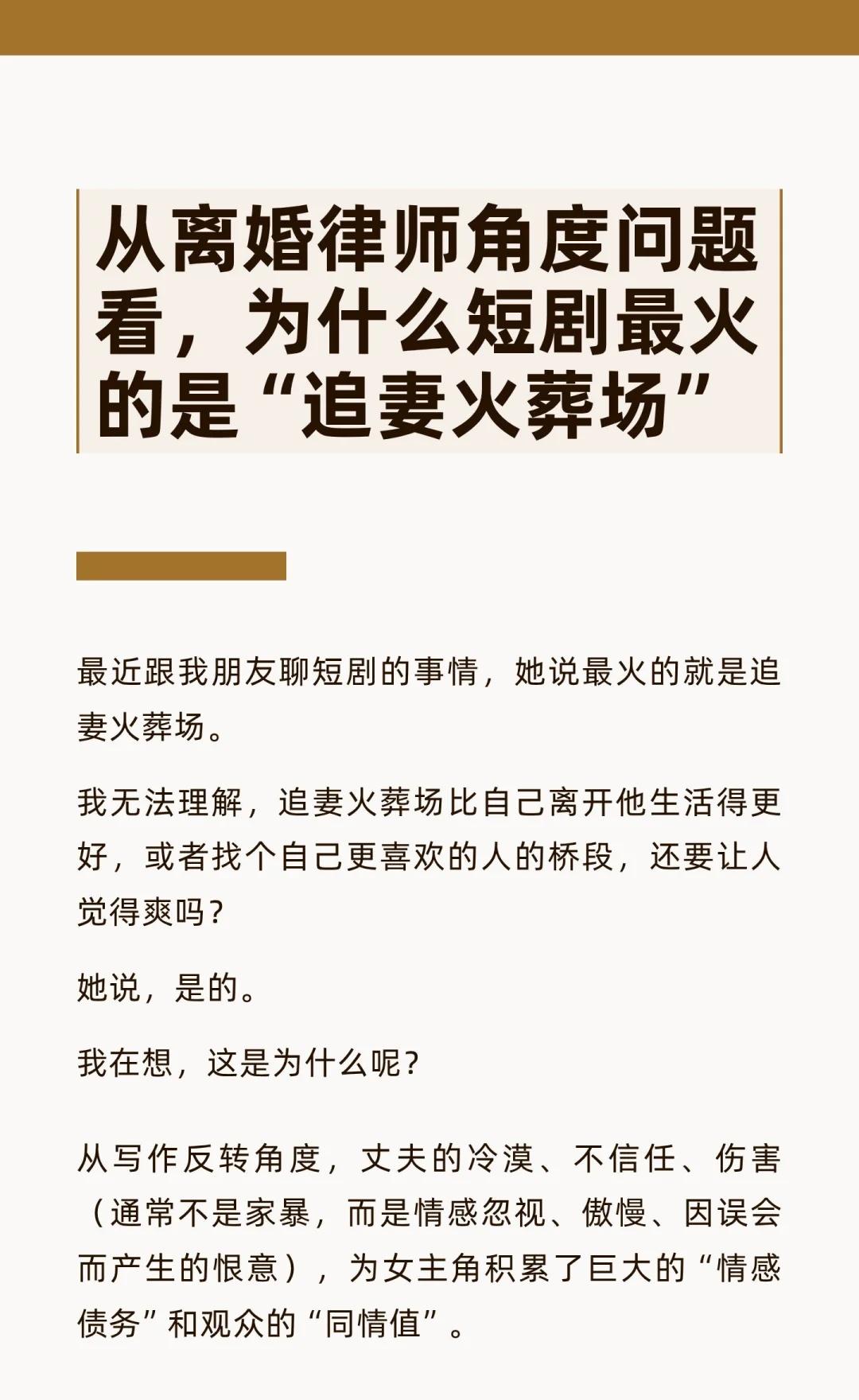 从离婚律师角度问题看,为什么短剧最火的是 跟我朋友聊短剧的事情,她说最火的就是追妻火葬场 我无法理解,追妻火葬场比自己离开他生活得更好,或者找个自己更喜欢的人的桥段,还要让人觉得爽吗? 她说,是的 我在想,这是为什么呢? 从写作反转角度,丈夫的冷漠、不信任、伤害(通常不是家暴,而是情感忽视、傲慢、因误会而产生的恨意),为女主角积累了巨大的“情感债务”和观众的“同情值” 后期丈夫的醒悟、忏悔、卑微追求,是对前期所有伤害的连本带利的情绪补偿。观众(尤其是女性观众)体验的是一种“你当初对我爱答不理,今天我让你高攀不起”的复仇快感和价值确认感。这种从谷底到巅峰的情绪波动,比一路顺风的“独自美丽”更具戏剧张力和情感冲击力 而且从现实情感来说,女性的付出和痛苦常常被伴侣忽视或视为理所当然。“追妻火葬场”的核心是丈夫的彻底醒悟。他终于“看见”了妻子的好,认识到了自己的愚蠢和错误。这种“被看见”的感觉,是对女性自身价值最有力的证明。而“独自美丽”虽然解气,但缺少了来自“施害者”的这份关键性的“认罪书”和“颁奖词”。追妻火葬场的这种从低位到绝对高位的逆袭,带来的“爽感”是无与伦比的。而“独自美丽”的爽,更多是自我实现的爽,缺少了这种在两性权力结构中将对手彻底征服的快感 此外,我觉得更重要的还是对不确定性的厌恶。 “独自美丽”或开启新恋情,意味着关系的彻底终结和重启,这带有不确定性和风险。“追妻火葬场”则是在不打破核心家庭框架的前提下,进行的一场极致的情感冒险。它满足了女性一种深层的幻想:在不离开的前提下,彻底改造伴侣,让关系达到一个前所未有的理想状态。 这是一种“修复”的幻想,比“推倒重来”更符合许多人对“从一而终”的深层期待 所以,多数女性还是活在新旧版本的交替挣扎里。时代无论多么进步,很多女性依然将“挽回家庭”、“改造浪子”视为一种更高的“功德”和“魅力证明”。相比之下,“离开”有时会被曲解为“逃避”或“失败”。剧中丈夫的回头,恰恰证明了女主角的“贤”与“强”最终战胜了一切 我觉得追妻火葬场更像是女性在现有社会结构下,一种用幻想编织的、精致的妥协 它既宣泄了对男权中心主义的不满(前期丈夫的傲慢就是其体现),又渴望在不颠覆现有秩序的前提下,获得绝对的胜利和补偿(后期丈夫的卑微就是其体现) 它回避了“离开”所带来的真实而残酷的代价,转而选择了一种在精神上彻底征服对方的叙事来获得满足 具体见图片婚姻 短剧