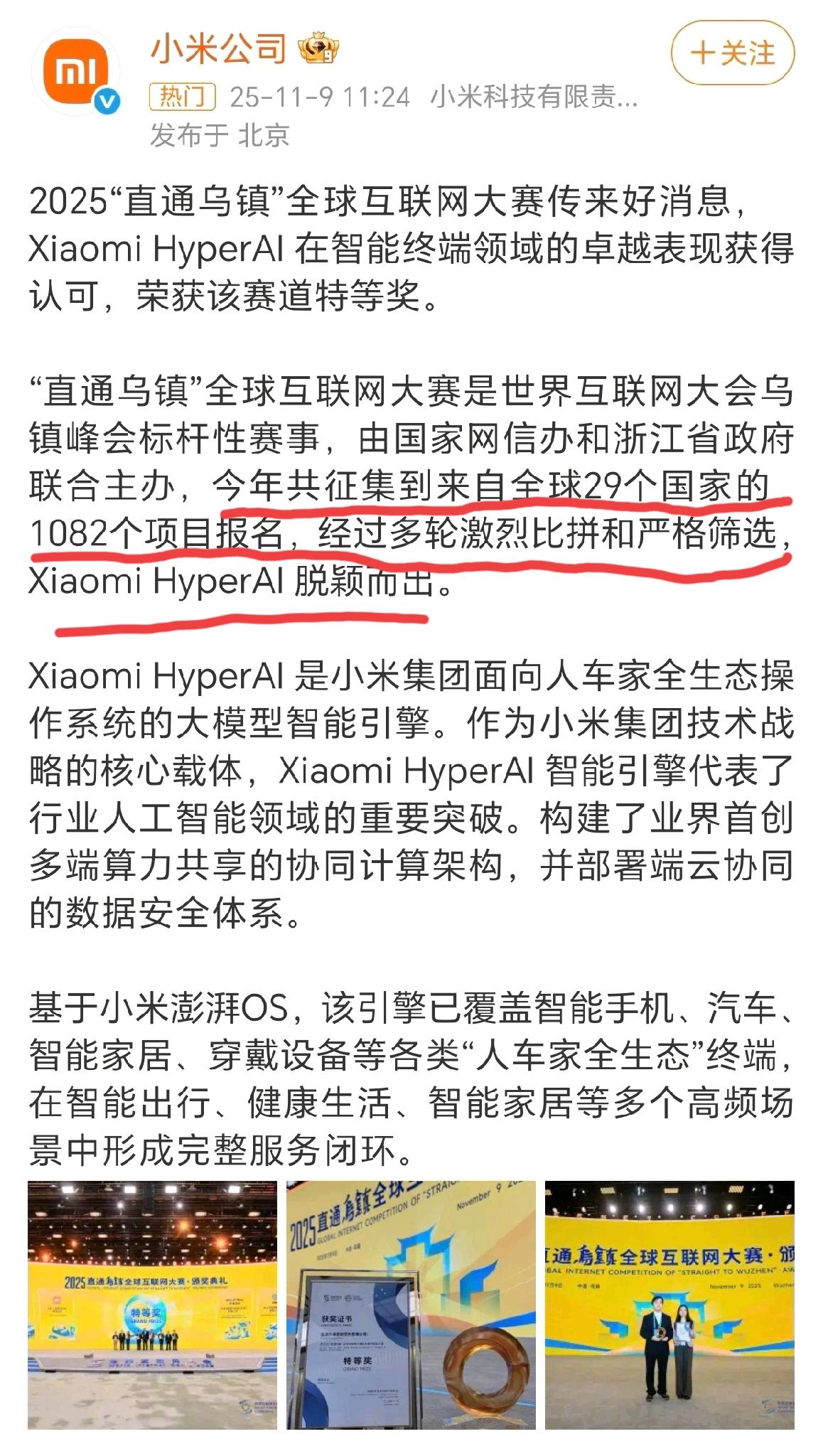 小米AI智能乌镇互联网大会上获特等奖,陈震力挺。真的是活久见了,陈震自出了车祸之后,已经不止一次向小米示好了,真的是太阳打西边出来了! 有没有一种可能,陈震是得到了上面的示意,才和小米放下成见、握手言和的? 又或者是,陈震曾发文称再不谈小米的事情,可是不谈小米又没有流量,只能勉为其难说说好话! 说回小米这次获奖的小米HYPER AI,是在全球29个国家1082个项目中脱颖而出,夺得特等奖的!为小米点赞!!!