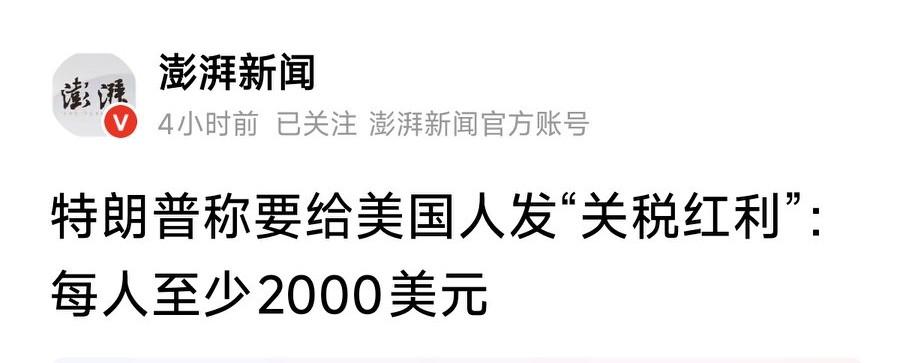 为拉拢人心,特朗普称要给美国人发“关税红利”:每人至少2000美元?特朗普又整新活,宣称要用关税收入给美国人发钱,每人至少2000美元,还把反对关税的人说成傻瓜。截至9月30日的财政年度,美国征了1950亿美元关税,比上一年多一倍还不止。 他这操作有自己的小算盘。此前民主党人说他给外国商品加税,成本会转嫁给美国消费者。现在发钱,能堵住这些人的嘴。不过,财政部长贝森特觉得,关税目的是重新平衡贸易,随着国内税收增加,关税增收效益会减少。而且特朗普也没说清楚这笔钱咋发、谁能拿。感觉他就是为了拉拢人心,至于最后能不能兑现,还真不好说。