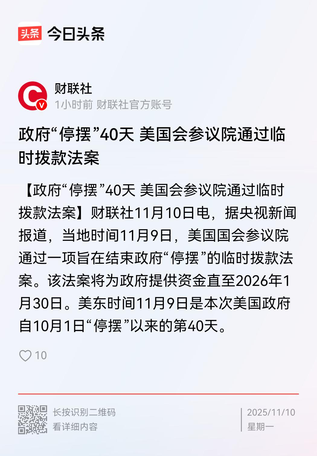 这一次持续时间长达40天的美国政府停摆终于结束了。根据财联社11月10日报道,现在美国参议院终于达成共识,通过了一项临时拨款法案,这个临时法案能够维持到2026年1月30日,在这之前美国政府基本上不用担心没钱发薪的问题了,政府停摆自然也将结束。 不得不说,这一次美国政府停摆,真的是一场精彩大戏,谁也没有想到美国政府会停摆这么久,在这段时间,美国军人都拿不到薪水,军人家属甚至要排队领取救济粮,美国航空交通更是有超过2000个航班取消,超过8000个航班延误,还有其他各类负面事件,不一而足。 这种种混乱表现,让全世界都大跌眼镜。 这一切都说明,美国政府现在内斗越来越激烈,民主党共和党几乎到了水火不容的地步,以至于连正常的政府运转都被破坏。按照这个趋势走下去,即便这一次临时拨款法案通过,恐怕要不了多久还会有新的负面事件发生,而美国两党斗得欢,最终承受代价的还是美国普通民众!