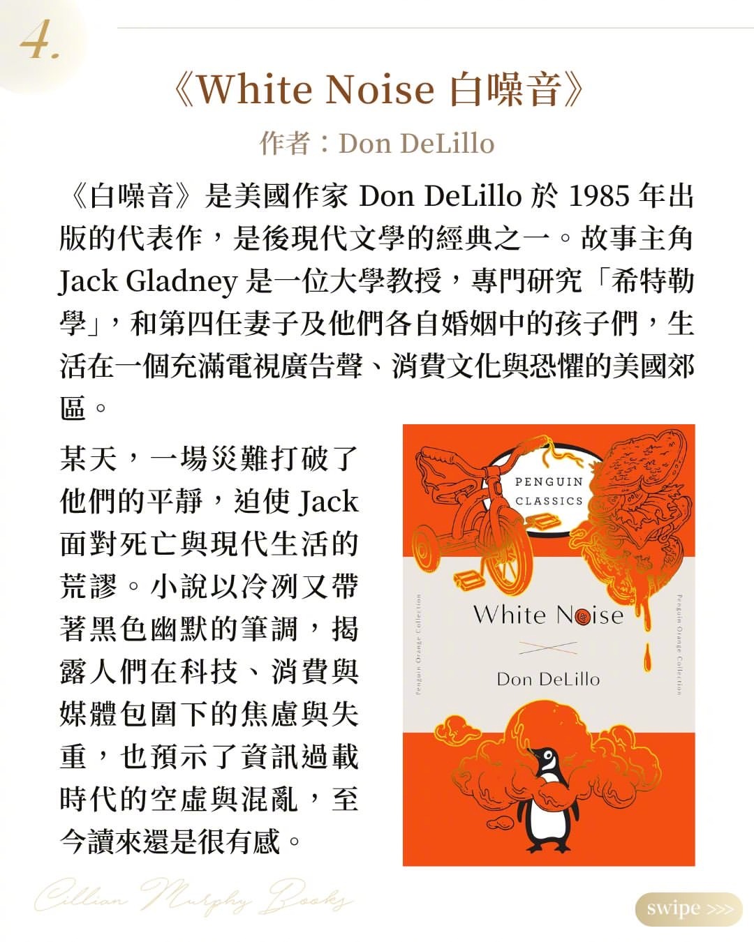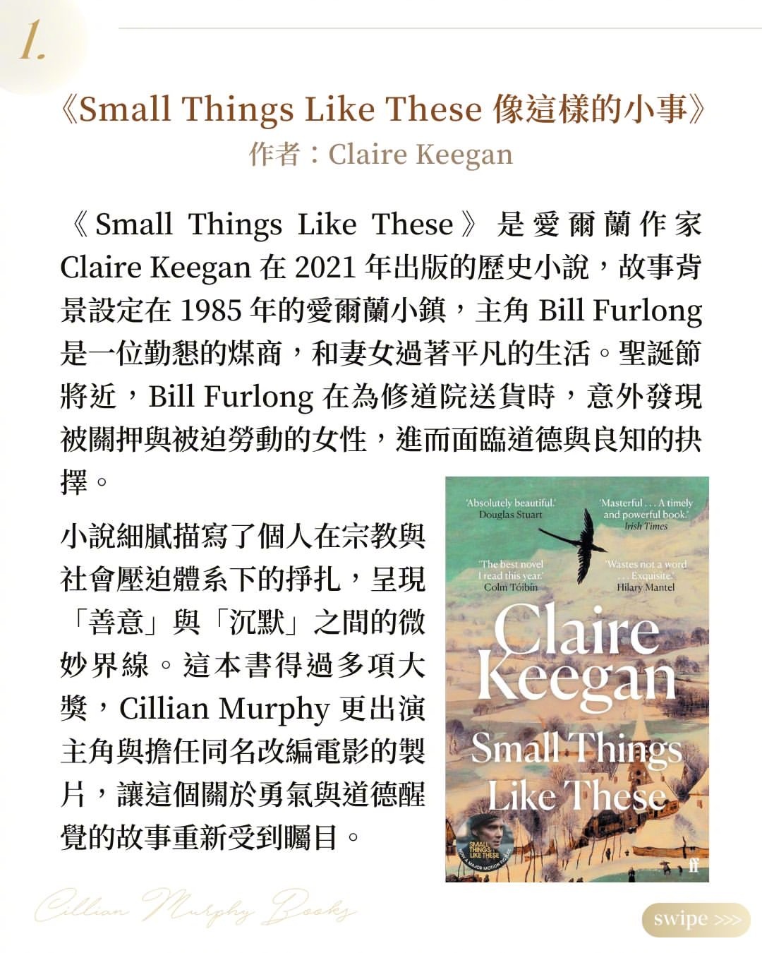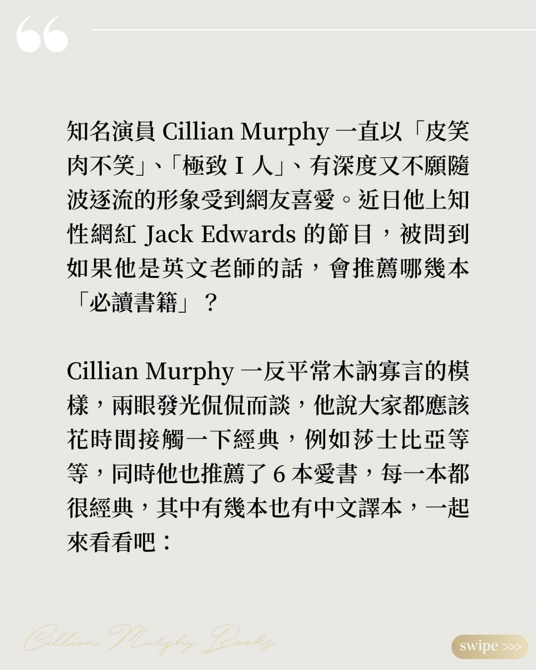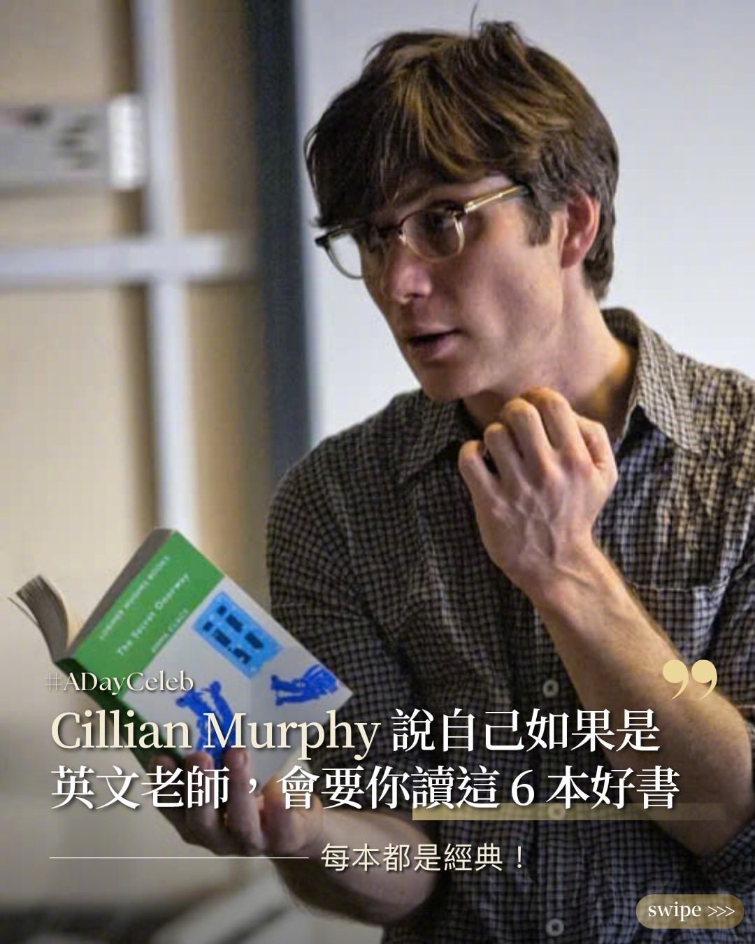 基里安·墨菲 Cillian Murphy 一直以有深度又不愿随波逐流的形象深受影迷喜爱。近日他上节目,被问到如果他是英文老师的话,会推荐哪几本“必读书籍”?他推荐了 6 本爱书,每一本都很经典!🌸🍃🍁