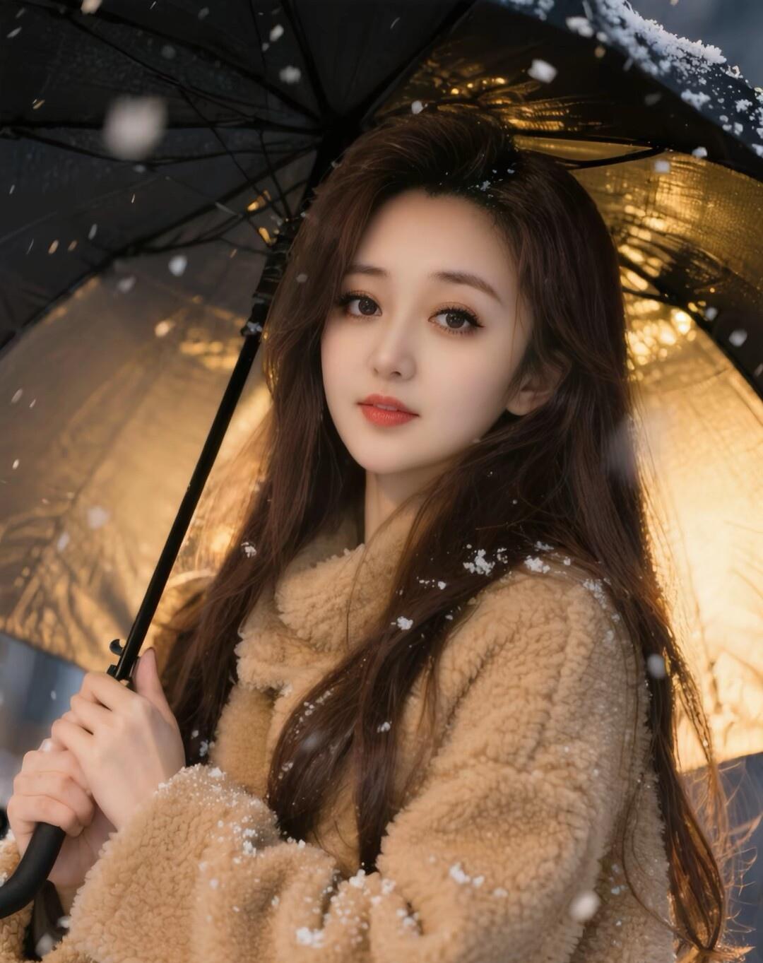 雪中美人伞下立,红唇轻启意难平。
