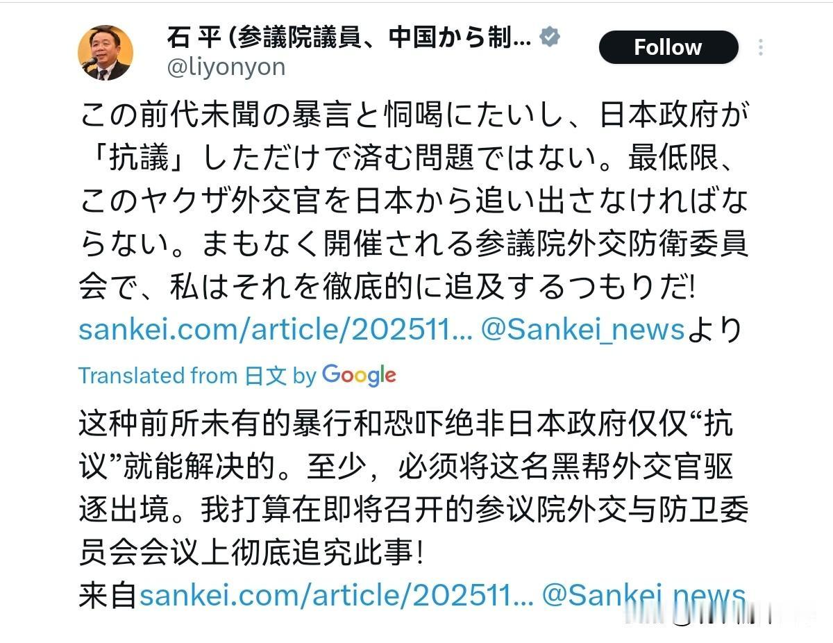 汉奸石平出来放话了,态度非常的嚣张!11月10日,对于我们外交官薛剑的言论,石平声称,这种前所未有的“暴行和恐吓”绝非日本政府仅仅“抗议”就能解决的问题。至少,必须将这名“黑帮”外交官驱逐出境。我打算在即将召开的参议院外交与防卫委员会会议上彻底追究此事! 很显然,石平的这一言论非常的嚣张,在被我们制裁之后,汉奸石平没有一丝的反省,没有一点的廉耻,而是第一时间出来狺狺狂吠。其所作所为,真是一点骨头都没有,其护主心切的行为似乎想要向投靠的主子表明,他是忠心的,顺服的。我们倒是要看看,这个汉奸到底有多大的能量? 台湾问题是我们红线中的红线,我们绝不会允许日本插手。如果日本政府不长眼,非得往上面撞,以军事手段介入,日本必将付出血的代价。像石平这种行为,上愧于祖先,下使后代蒙羞,一生都要被贴上耻辱的标签。这样出卖祖国利益的人,就算是日本人也不会瞧不起。这些人品低劣的人能够混迹于日本政府,这只能说明日本政坛是藏污纳垢之地。