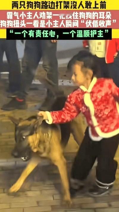 “笑不活了!”湖南,两只狗狗在路上突然打起来,围观的大人都不敢上前,没想到人群中出来一个小女孩,直接上前一把拽住狗子的耳朵。 烈日当空的湖南街头,行人们享受着悠闲的步调,却未曾想,会在路中央上演这场“狗界交锋”。 事件发生在11月7日,在街上各自行走的行人们,被突如其来的狗吠声吸引住了目光。 突然的骚动,让烧烤店的彭老板抬起了头,看到了街边令人瞠目结舌的一幕。 在他的眼前,一只体型硕大的黑色牧羊犬正与一只小狗翻滚扭打,空气中弥漫着犬毛飞扬的景象,伴随着彼此威胁性的低吼声,让人不禁心惊胆战。 围观的人们纷纷驻足,有的甚至想要靠近却又胆怯地退回,毕竟,没人愿意冒被狗咬的风险,更不想因此惹上麻烦。 但是就在黑背和小狗斗得难解难分时,一个小小的人影勇敢地从人群中走出。 小小年纪的乐乐,只有五岁,却是黑背的主人。 透过她严肃的面容,找不到丝毫同龄孩子常见的胆怯。 她坚定地走向打斗中的狗狗,胖乎乎的小手直接抓住了黑背的耳朵,并且用稚嫩的声音命令:“不许打架!跟我回家!” 就在所有人都为乐乐的勇敢所震惊时,之前还气势汹汹的黑背瞬间停下动作。 它略微挣扎了一下,扭头看到是自己的小主人,立刻变得乖巧。 原先凶猛的态度不见了,耳朵垂下,尾巴也夹在了腿之间,只能发出“嘤嘤”的细声,就像是在为自己的错误道歉。 而小狗仍然不甘心地发出低吼,但黑背仅仅是畏缩地看了一眼,便乖乖地跟着乐乐离开了现场。 这一幕被彭先生记录下,上传到网上,仅24小时内,点赞数便突破了47万。 网友们纷纷被小乐乐的举动打动。 尽管这个事件让人发笑又感动,但深思却发现,背后隐藏的问题不容忽视。 两只狗狗之所以会打斗,源于它们都没有牵绳。 如果狗主人尽到牵绳的职责,这场冲突就不会发生。 湖南长沙、株洲、岳阳等地都出台了与饲养犬类相关的条例,比如《岳阳市养犬管理条例》明确要求外出时必须用不超过两米的狗绳牵狗。 然而现实中,总有一些宠物主人觉得自己的狗温顺,因此不牵绳,这样不仅对他人造成潜在威胁,也让自己的宠物面临风险。 曾有类似事件发生在长沙,当时未拴绳的巴哥挑衅牵绳的金毛,结果被金毛重伤,主人怎么都拉不开。 乐乐的勇气的确令人感动,但孩子贸然上前实在很危险。 即便这次幸运没受伤,但换个场景,可能结局就不那么乐观。 其实大人不敢上前也有他们的顾虑,预测不了狗的行为,而且可能导致更多麻烦。 但同样的,如果大人能勇于担当,正确地制止冲突,也就不需要小孩子去冒险。 狗对小主人的服从令人暖心,这是长期陪伴和信任的结果。 这并不能成为人们在养宠物时忽视安全的借口。 文明养犬不仅是规则,更是对自身、他人和宠物的多重责任。 家长也应当培养孩子的安全意识,教导他们正确应对类似事件,保持安全距离,寻求大人帮助,而不是自己贸然上前。 我们欣赏乐乐身上迸发出的责任感,小小年纪懂得管束自己的宠物,这份责任心值得称道。 人与动物和谐共处的景象能治愈人心,但这种和谐需要用规则去维系。 希望每位养宠人士都能引以为戒,出门牵好狗绳,做好安全防护,不要将温馨的小事变成伤人的隐患。 你家里有没有饲养宠物? 如果遇到狗狗打架的情况,你会怎么应对呢? 也许,这个问题的答案能让我们彼此更多理解。 信源:两只狗狗路边打架没人敢上前,霸气小主人劝架一把拽住狗狗的耳朵-星尘视频