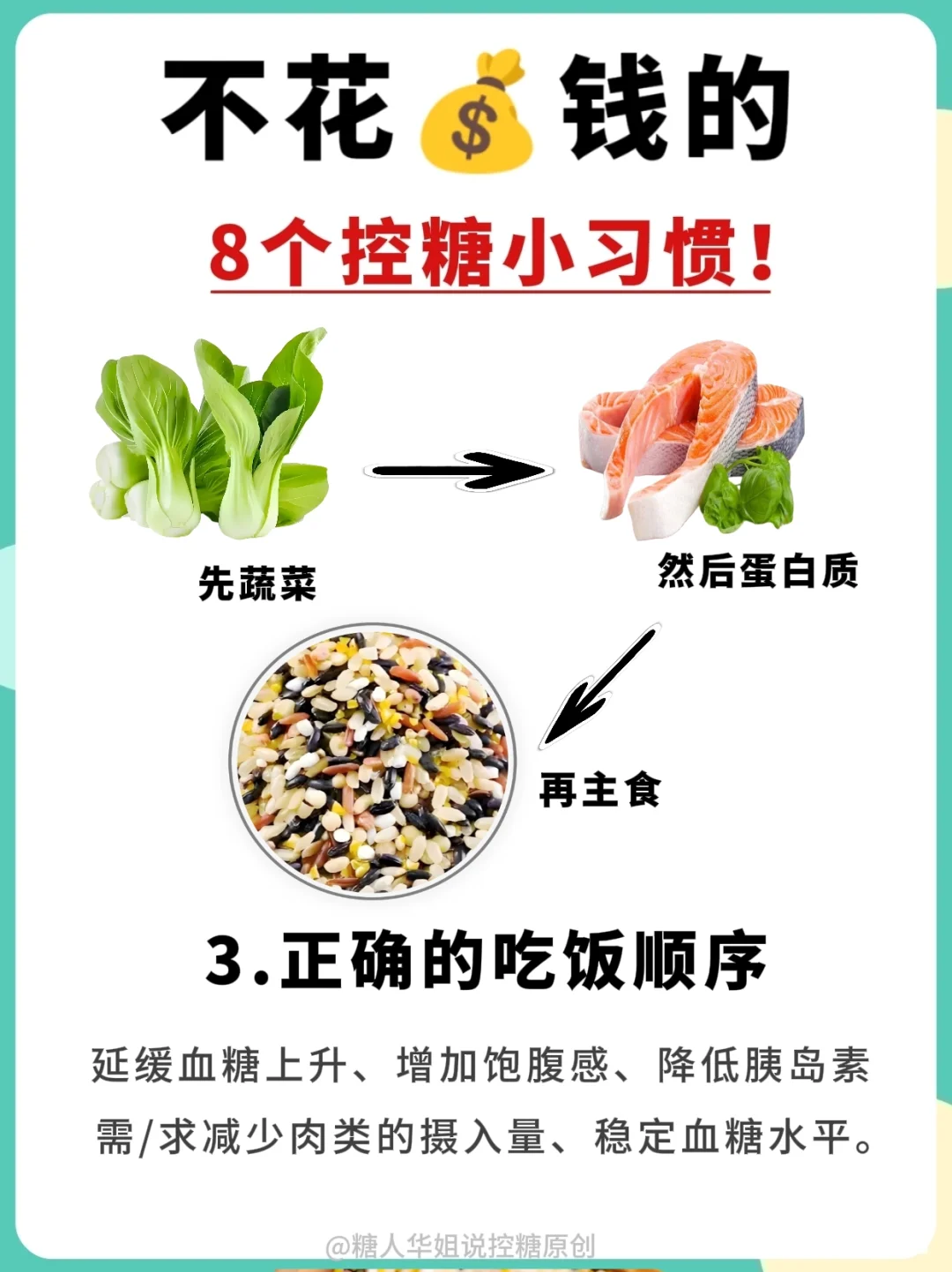 ∽建议:即使饮食顺序帮助控糖,仍然要控制总热量摄入👉每餐饮食中要包括适量的蛋白质、脂肪和碳水。