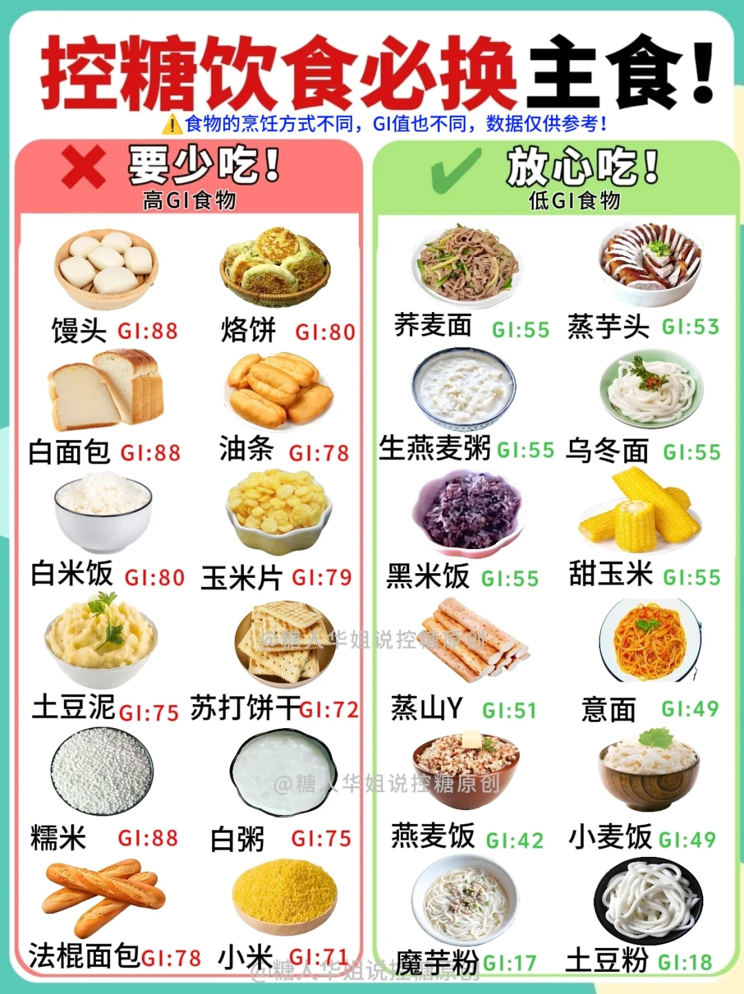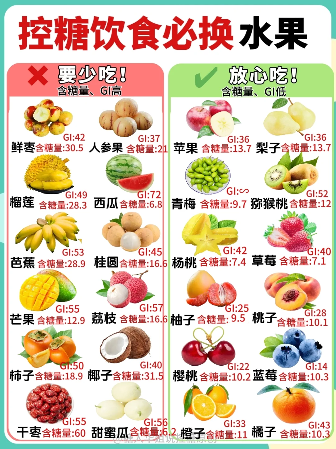 ∽建议:选择低GI、高纤维、低脂肪、营养丰富的食物 ,有利于控糖和促进整体健康。