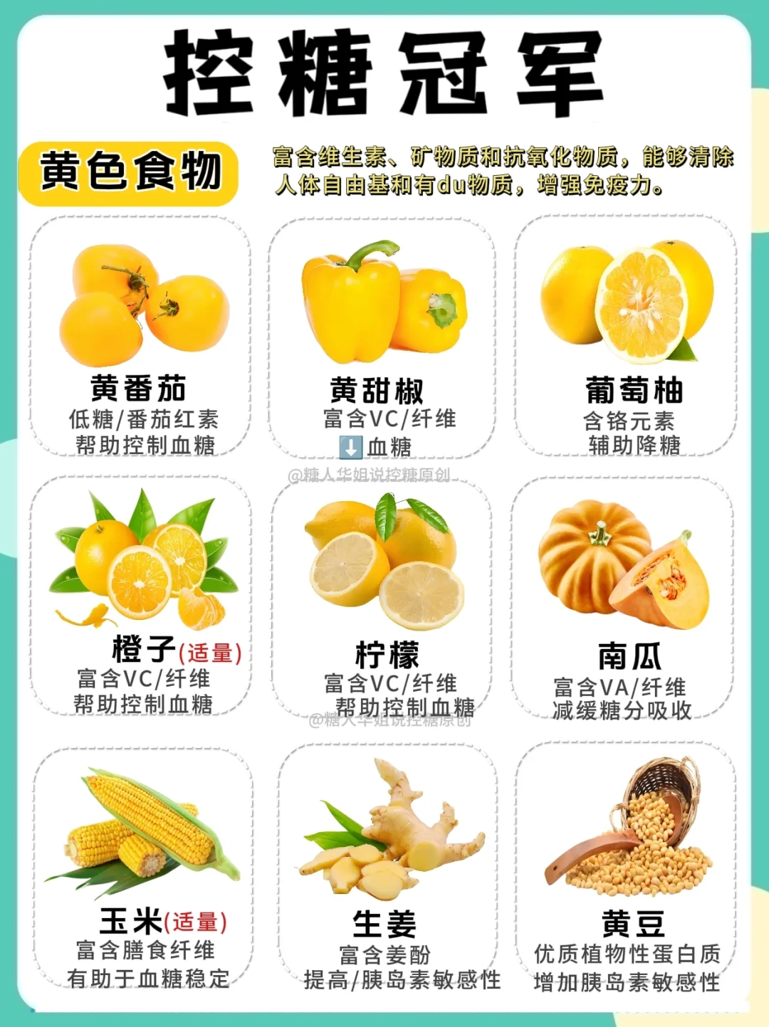 👉黄色食物富含蛋白质、纤维素和镁等,有助于增加胰岛素敏感性、改善胰岛素的分泌功能,促进糖糖的dai谢和利用等。