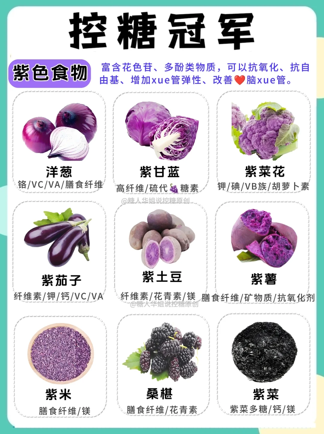 👉紫色食物富含花青素等,不仅有助于控糖,还能改善视力、抗氧化、保护❤️等作用,在控糖一日三餐中适量增加紫色食物的摄入。如图4⃣👆