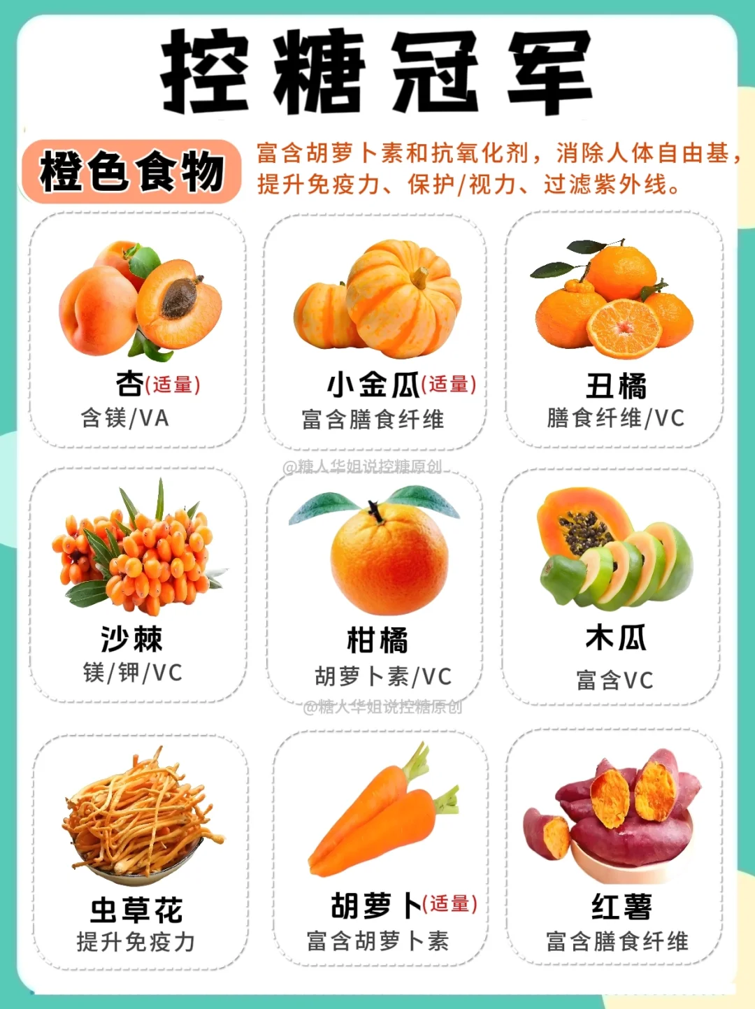 👉橙色食物富含维生素、膳食纤维、抗物质、胡萝卜素等,可增强免疫力、抗氧化等作用 ,对糖人来说,不仅有助于控制血糖,还能提供丰富的营养。如图3⃣👆