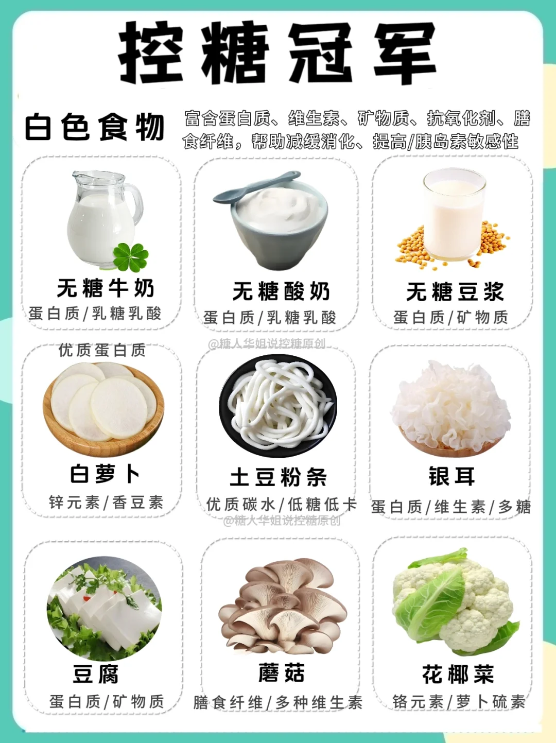 👉白色食物富含膳食纤维、蛋白质、维生素、钙、硒等,帮助控制血糖,增加饱腹感,延缓食物的消化速度,减少高热量食物的摄入。如图6⃣👆