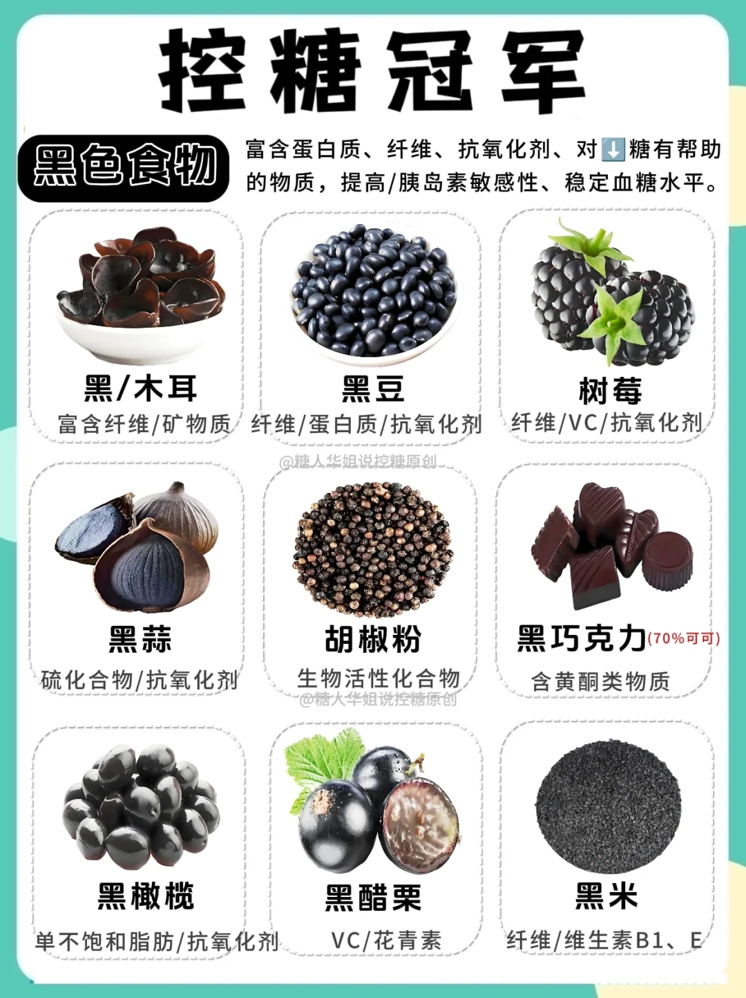 👉黑色食物富含铬、多糖、膳食纤维、抗氧化物质等,提高/胰岛素敏感性,促进胰岛素分泌,提高/胰岛素的利用/率。如图7⃣👆