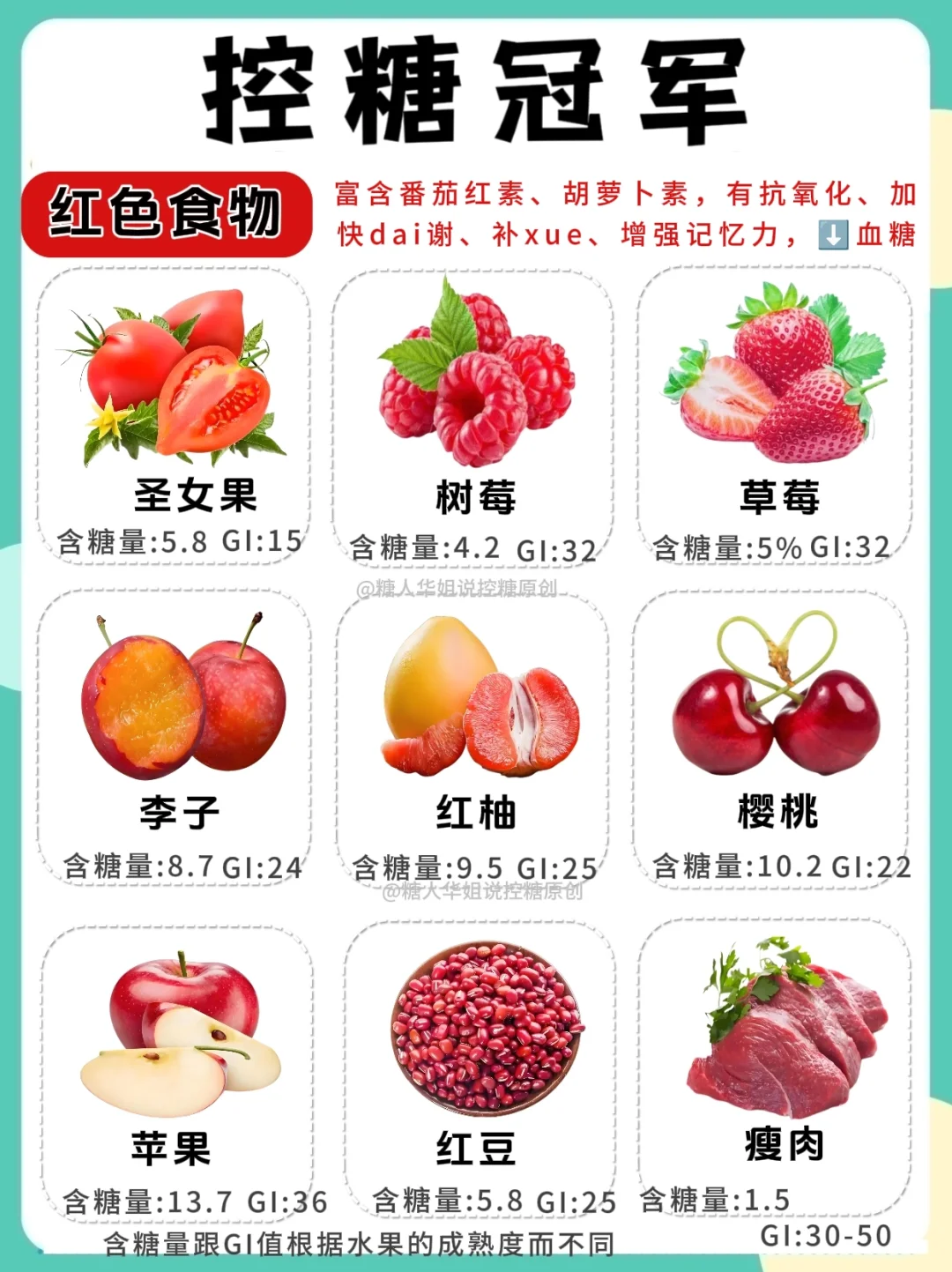 👉红色食物富含铁、类胡萝卜素、蛋白质、膳食纤维等,对糖友们来说,是很好的选择 ,可帮助控制血糖 ,提高/身体的抗氧化能力。如图5⃣👆