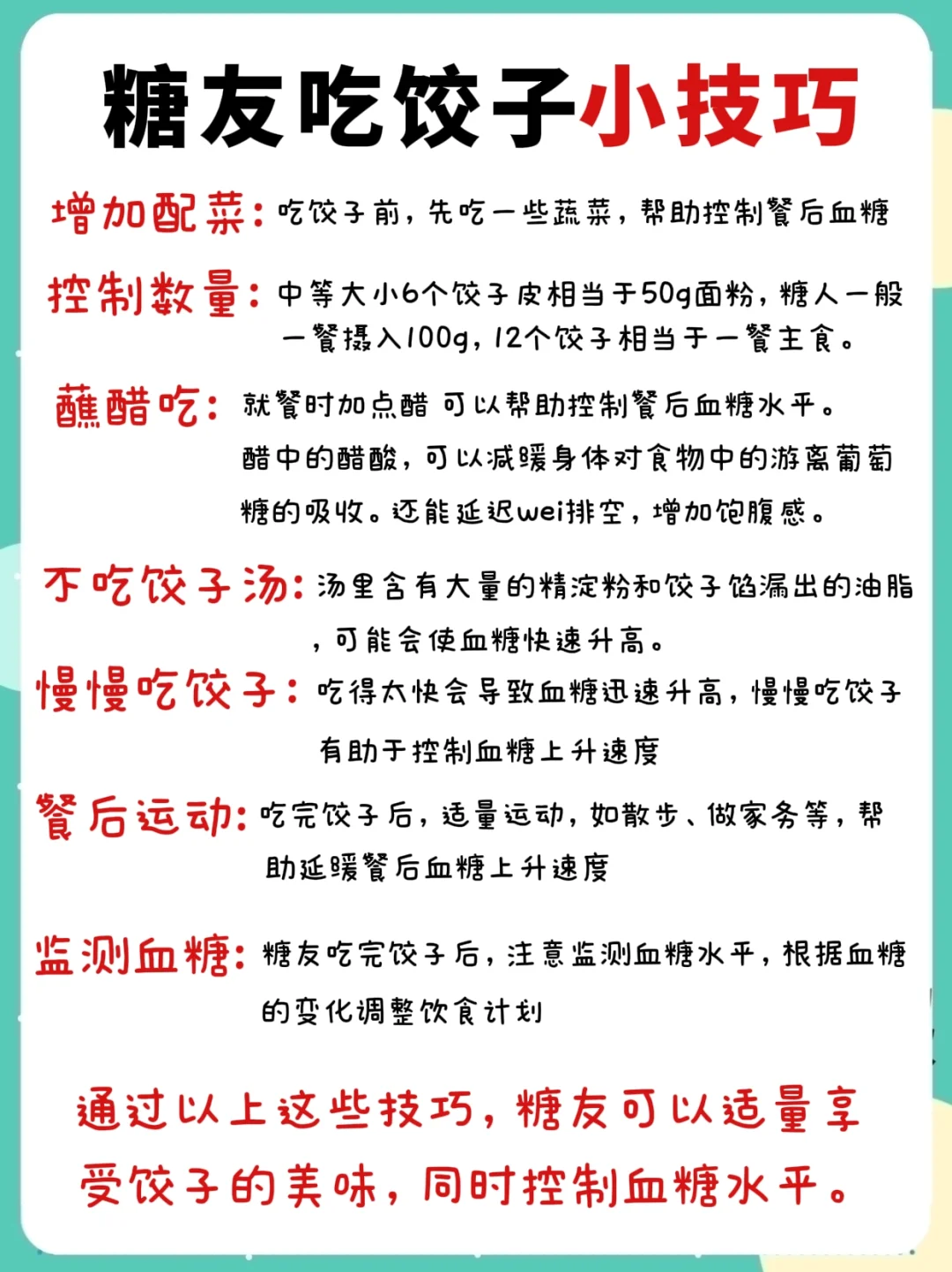 通过以上这些技巧,糖友可以适量享受饺子的美味,同时控制血糖水平。
