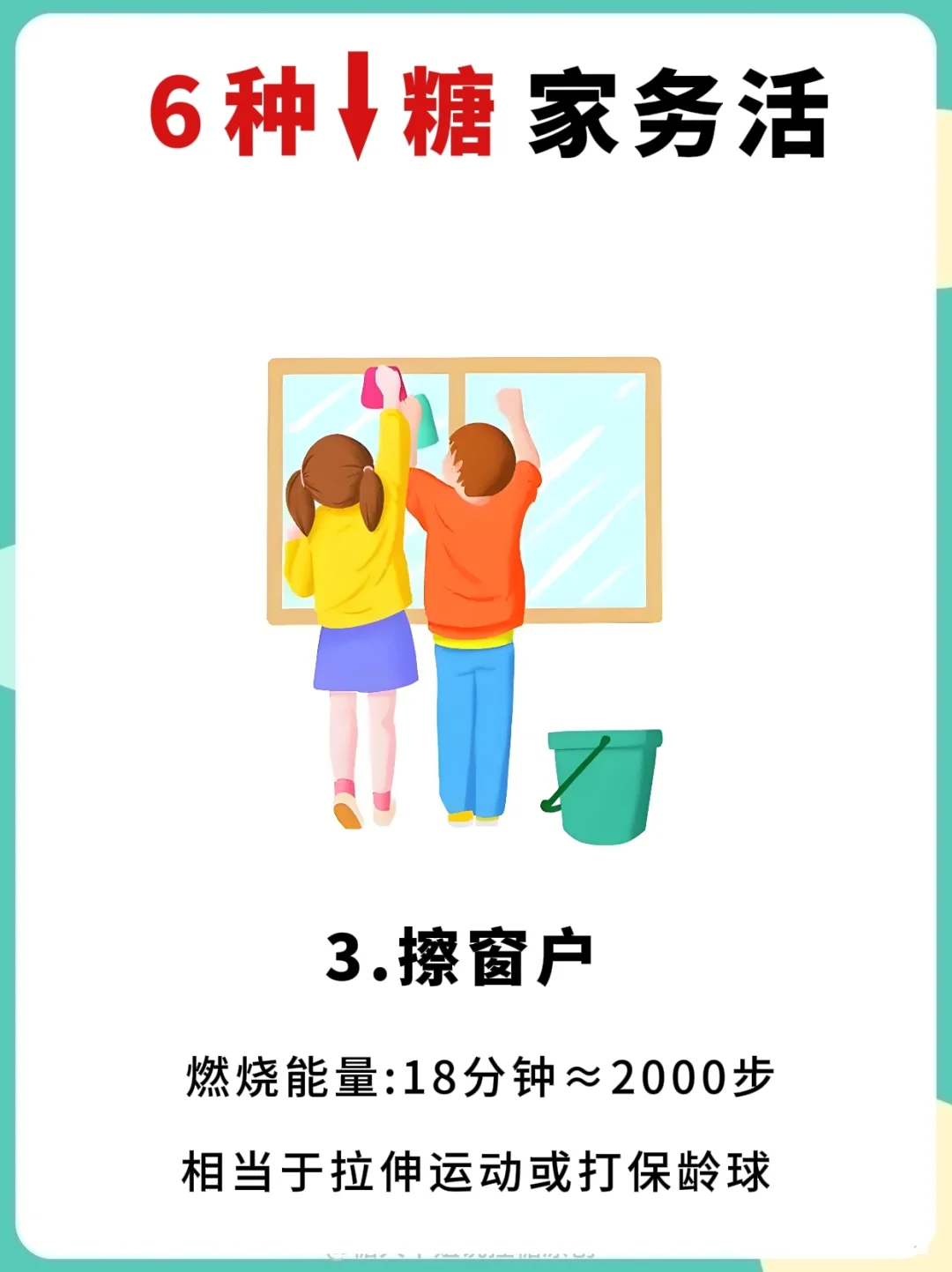 -控糖的家人们,千万不要小瞧擦窗户的运动量,它相当于拉伸运动和打保龄球❗️擦窗户18分钟,燃烧的能量相当于走2000步。还可以一边擦窗户一边哼歌或听书,帮助舒缓压力,放松心情。