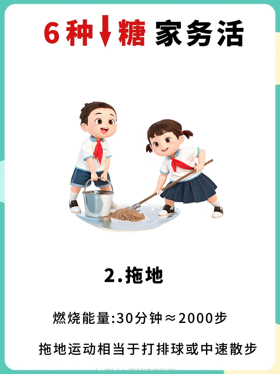 -拖地是体力活,拖地相当于打排球或中速散步,拖地16分钟燃烧的能量相当于走2000步。饭后拖地,既能清洁家里又能消耗掉食物产生的糖分。