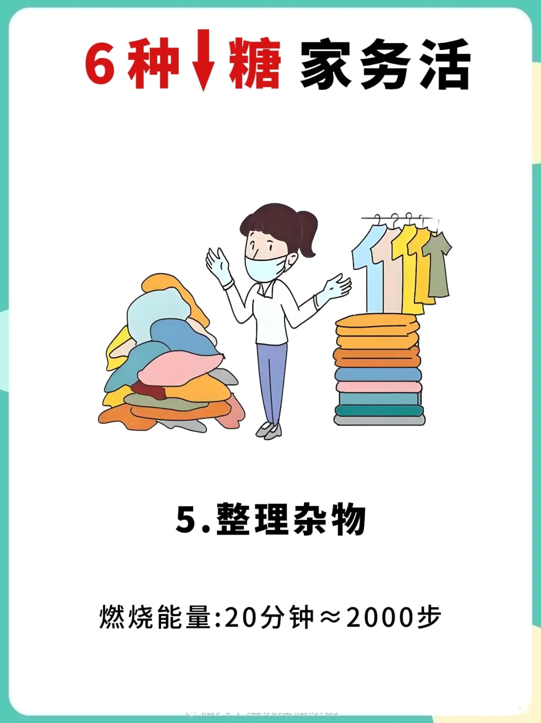 -整理杂物20分钟燃烧的能量相当于走2000步。它不仅让你家里清洁整齐,还可以帮你消耗掉多余的能量,降低血糖。
