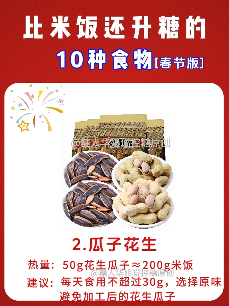 2⃣花生瓜子:50g花生瓜子含有的热量≈200g米饭,而且还容易吃多,建议每天不超过30g(带壳)。