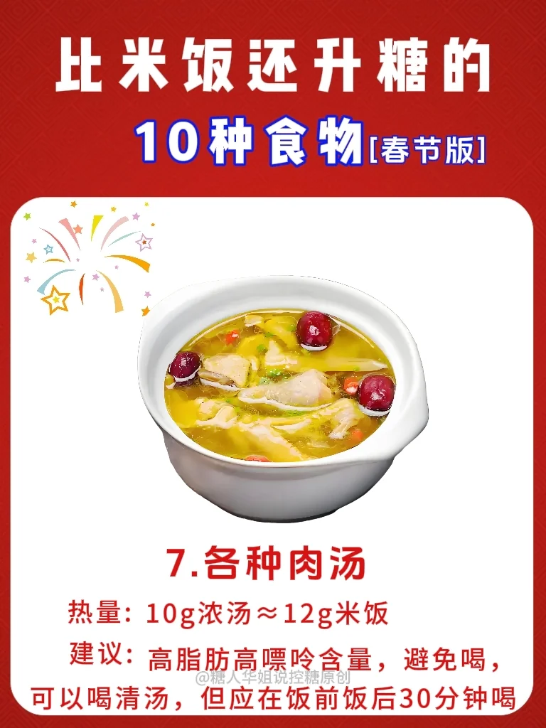 7⃣各种肉汤:如图7⃣👆,高热量高脂肪高嘌呤高胆固醇,不利于控糖控体重控血脂。