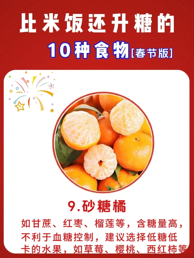 9⃣砂糖橘:如图9⃣👆,属于高糖分水果,还有榴莲、甘蔗、红枣、桂圆等,都是春节餐桌上常见的水果,尽量不要吃。