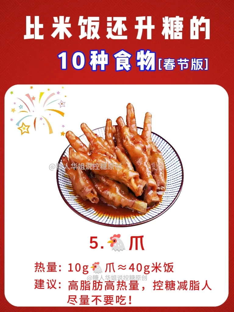 5⃣🐔爪:如图5⃣👆,高脂肪高热量,糖人尽量不要吃,实在想吃就吃鸭爪,但一定要减少主食的量,以免影响血糖控制。