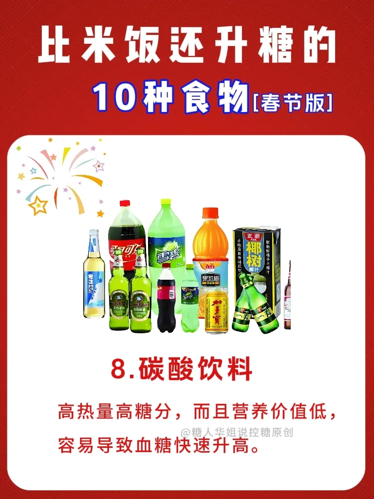 8⃣碳酸饮料:添加了大量的糖分,而且营养价值低,加速血糖上升速度。另外,春节少不了饮酒,过多饮酒会增加肝*脏的负担,影响糖代谢。