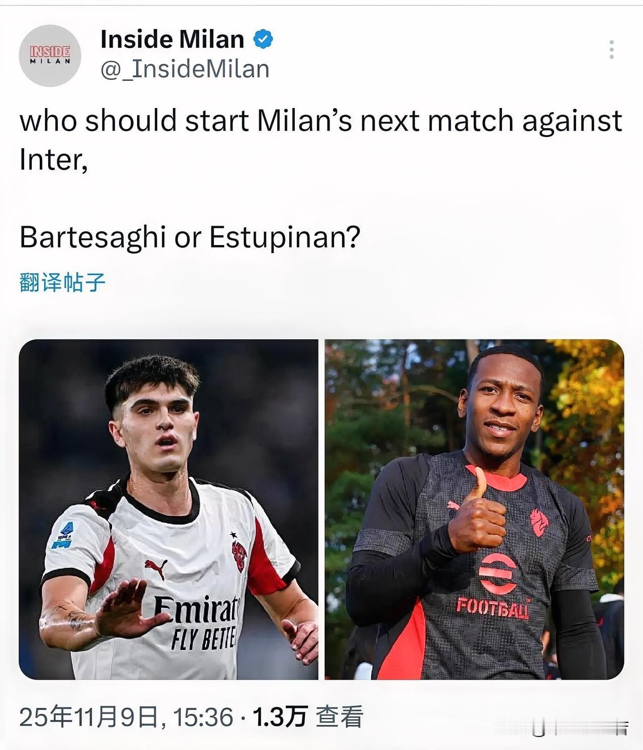 巴特萨吉!今天消息说巴特萨吉与埃斯图皮尼安谁会出战国际米兰。意思就是阿莱格里会在国际米兰比赛中选择巴特萨吉还是埃斯图皮尼安,按照阿莱格里之前的做法,埃斯图皮尼安很可能会坐几轮替补。 个人觉得埃斯图皮尼安就是这个水平,他加盟之前就是现在的样子,只不过之前在边路有拉比奥特,后来拉比奥特受伤了,他也伤了,首轮比赛和米兰对帕尔马是两场埃斯图皮尼安出场但没有拉比奥特的比赛,中场没有拉比奥特的保护,埃斯图皮尼安所有短板都展现出来了,打国际米兰对位泥头车,如果拉比奥特不能出场,那比赛就不用看了,左路肯定被打爆。 当然巴特萨吉也不比埃斯图皮尼安出色,巴特萨吉是典型的边后卫踢法,他的防守站位和防守习惯更好,之前进攻能力不足,但最近几场比赛是越来越好,米兰球迷已经在讨论冬季窗口了,今天有消息说俱乐部会在冬季窗口补充左边翼卫,估计俱乐部也发展了问题,巴特萨吉现在是合格的轮换,但埃斯图皮尼安不具备主力球员的能力。