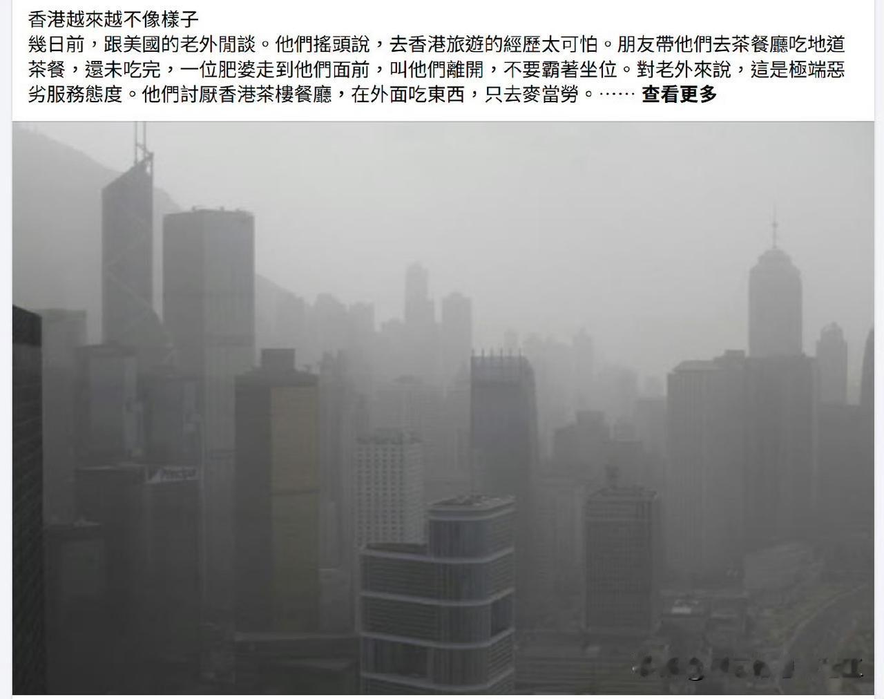 香港网民发帖,几日前,跟美国的老外闲谈,他们摇头说,去香港旅游的经历太可怕。 朋友带他们去茶餐厅吃地道茶餐,还没吃完,一位肥婆走到他们面前,叫他们离开,不要霸占座位。 对老外来说,这是极端恶劣的服务态度。他们讨厌香港的茶楼餐厅,在外面吃东西只去麦当劳,这样一来,香港该如何吸引外国游客?
