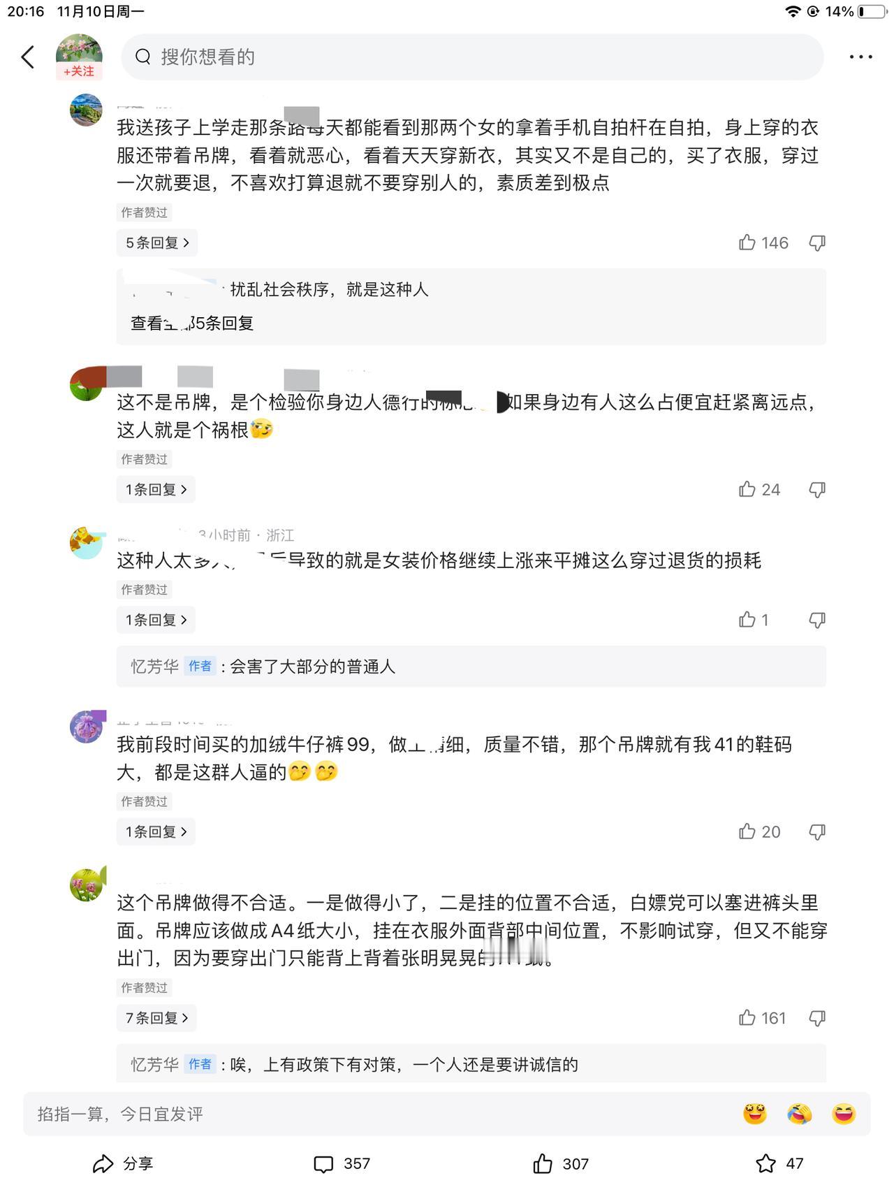 吊牌美女! 这不是吊牌,是个检验你身边人德行的标志[灵光一闪]如果身边有人这么占便宜赶紧离远点,这人就是个祸根[灵光一闪] 商家真是黔驴技穷了!做这么大的吊牌,人家也不减掉,穿着照样出门!你说你还有什么招数?道高一尺,魔高一尺半。道高一两尺,魔高道一尺半!容你变,人家始终一尺半~不要脸就完了!不要脸破你十八般武艺,任你七十二变,一个不要脸全部解决! 我前段时间买的牛仔服,就是旧的,吊牌还没摘。我扔洗衣机里洗两遍。留下了。别再流通了。希望这样的小仙女少点吧!这市场已经变态了!