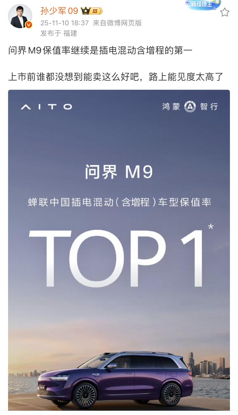 孙少军:问界M9保值率继续是插电混动含增程的第一! 上市前谁都没想到能卖这么好吧,路上能见度太高了,其实还被问界M8分流了一点,如果没有分流那么这个车的销量还能保持非常高。 而且这个车中间经历了一次小改款,竞争能力变得更加充足了。问界M9、问界M8和问界M7已经成为了现在增程车领域的标杆产品了。 各位是怎么看的?欢迎评论区留言。