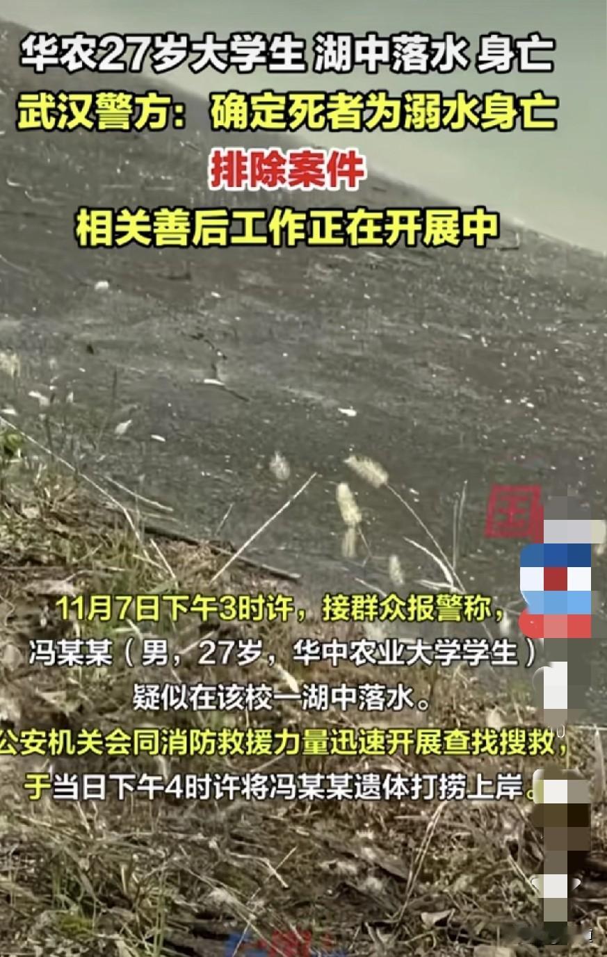 真是太令人惋惜了,11月7日下午3点多,武汉华中农业大学在读博士生冯某某在校园内不幸失足落水溺亡。 4点多钟被搜寻打捞上来。 才27岁呀,太令人心痛了。 培养一个博士家长得花了多少钱呐,他自己又熬了多少夜,美好的人生还没开始,就意外结束了。 话说大学校园内的水域都没有护栏吗? 看来意处无处不在呀,我们生活中一定得小心小心再小心呀。