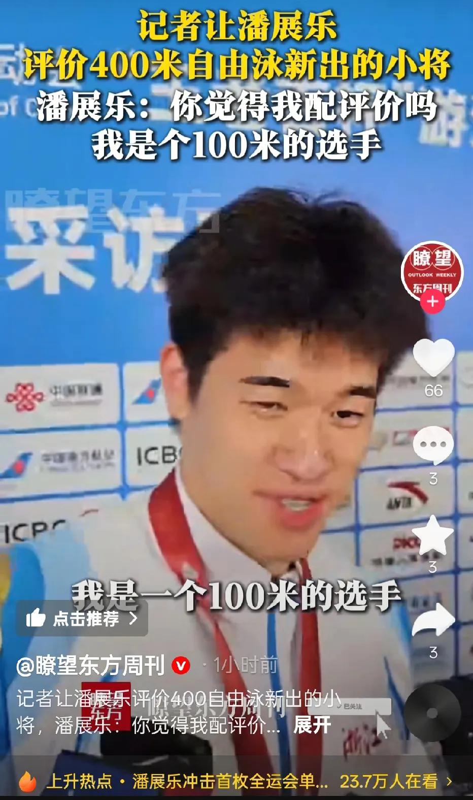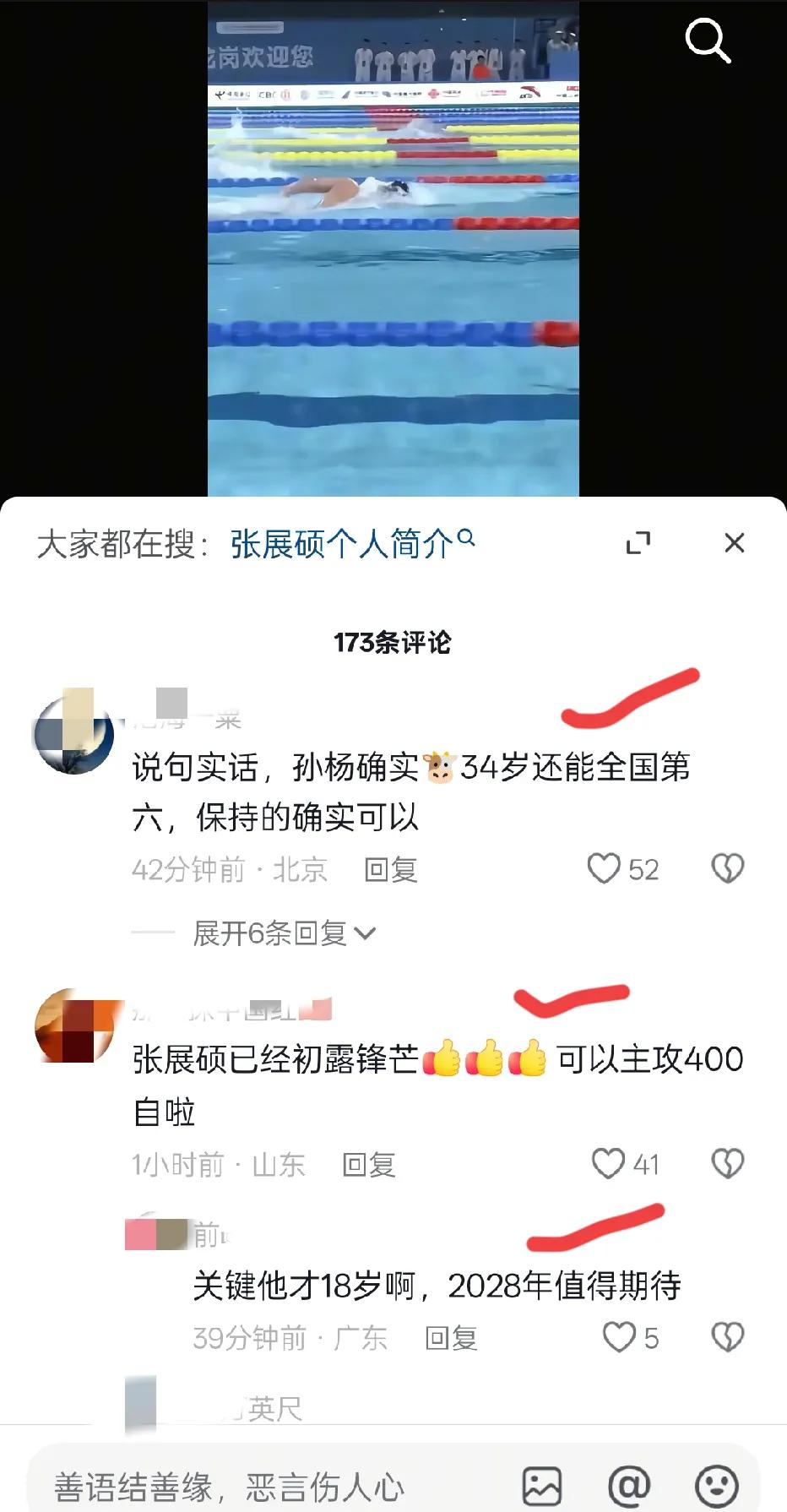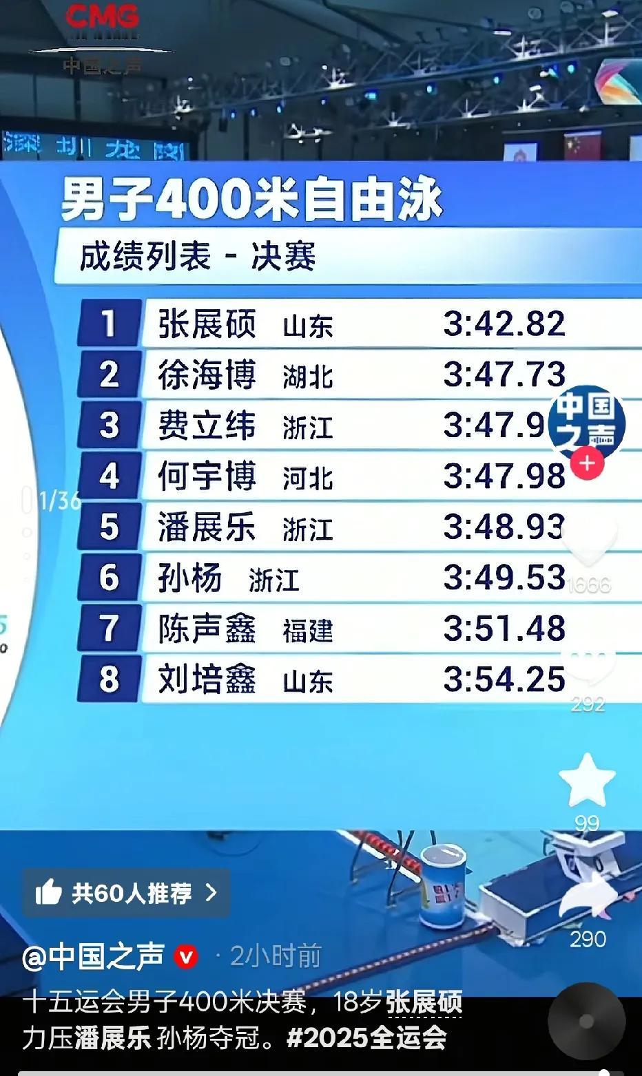 今晚看了这个男子400米自由泳决赛,这位来自山东——18岁的张展硕,夺得冠军🏆!潘展乐排第五名,孙杨第六名。可想而知,这个18岁的小将有多厉害[赞] 当我看到画面里,最后冲刺阶段,画面里只看到了张展硕一个人游在前面时候,真的感慨到,太强了! 我看到有网友留言说,张展硕已经初露锋芒了, 可以主攻400自由泳啦~关键他才18岁啊,2028年值得期待! 还有网友说, 说句实话,孙杨确实牛,34岁还能全国第六,保持的确实可以!因为有这么多年轻的00后选手,不容易![赞] 然后对于潘展乐的采访,我看到有记者问他,怎么评价400米自由泳比赛新出的小将,怎么看待现在的竞争氛围?哈哈,潘展乐情商很高,也很幽默,回答道:你觉得我配评价吗?[呲牙]还说道他自己是个100米的选手。 真好,无论是100米还是400米,我们都有很棒的运动员,加油!