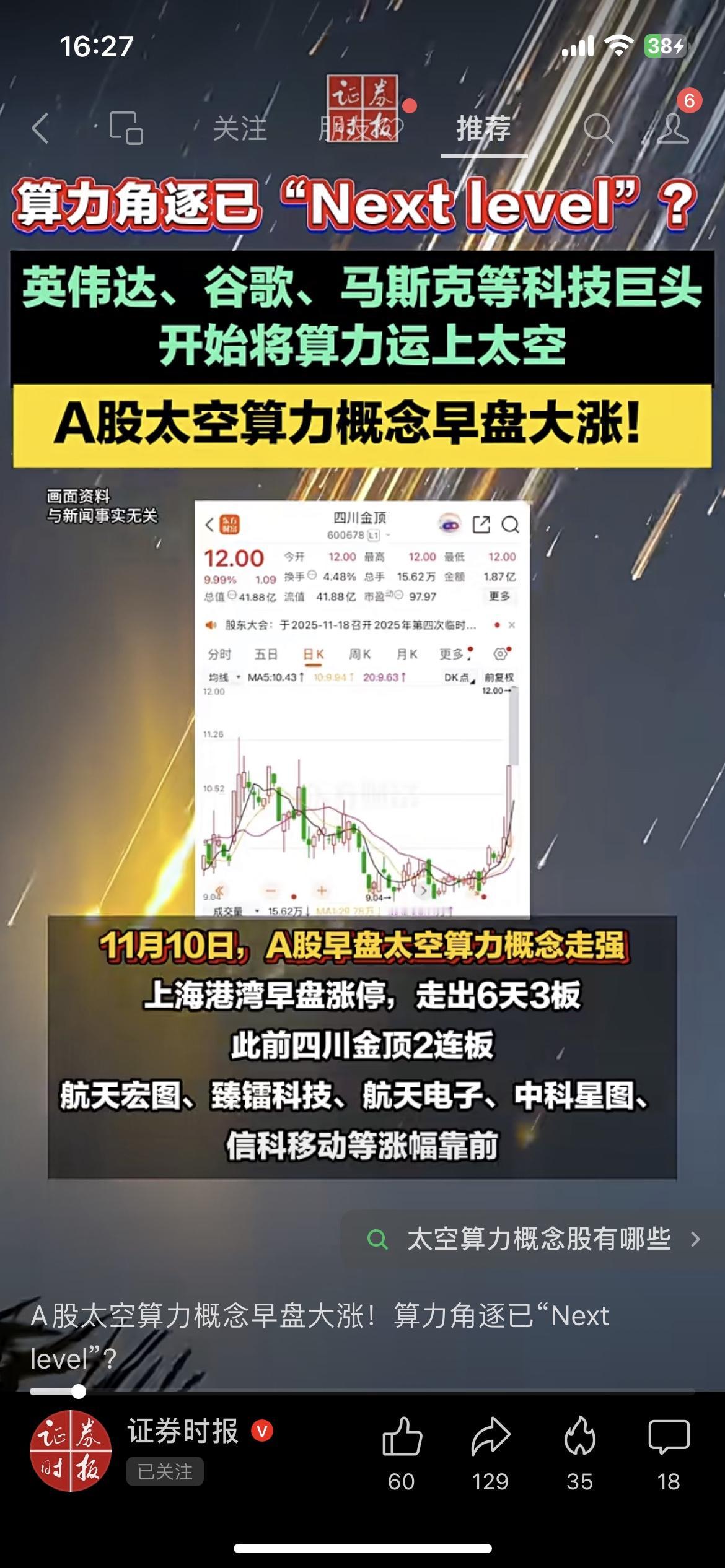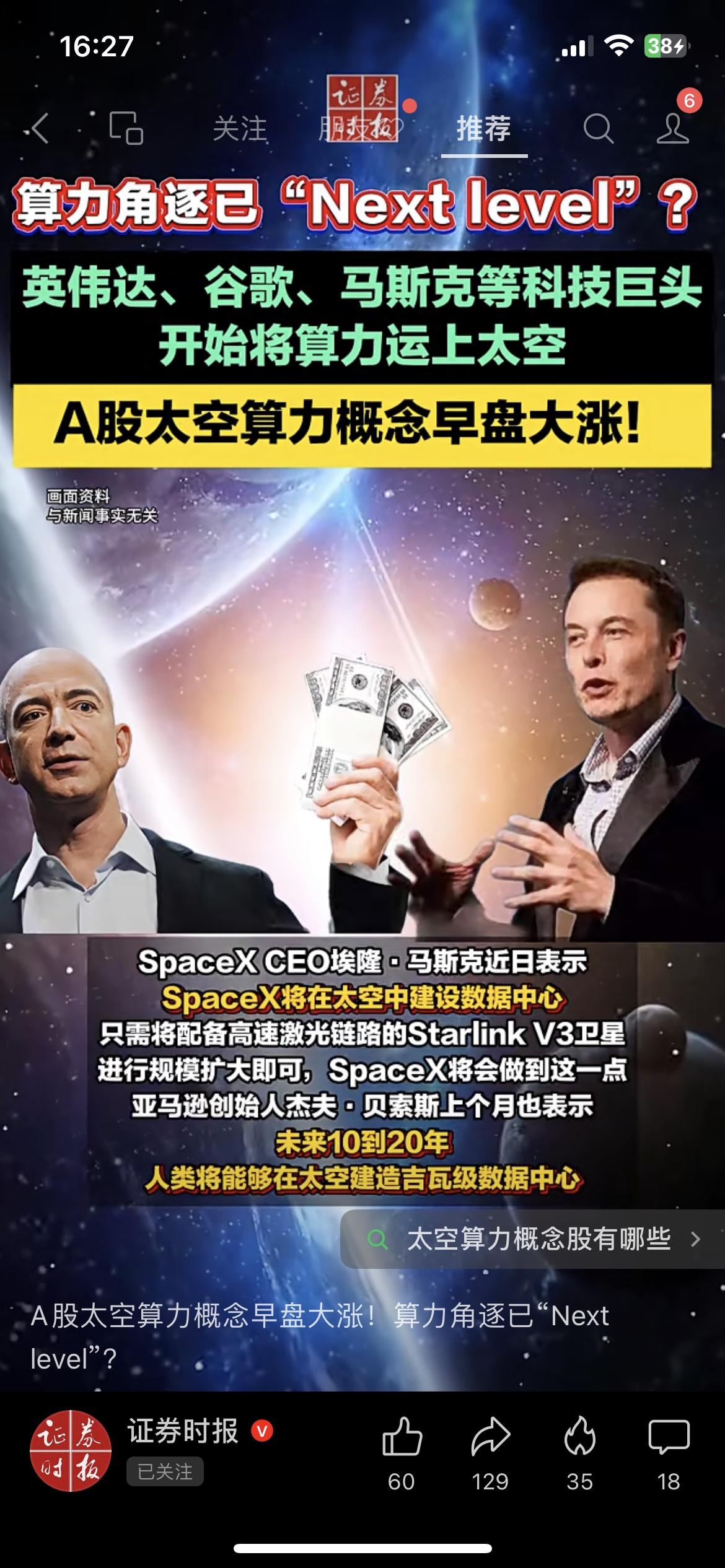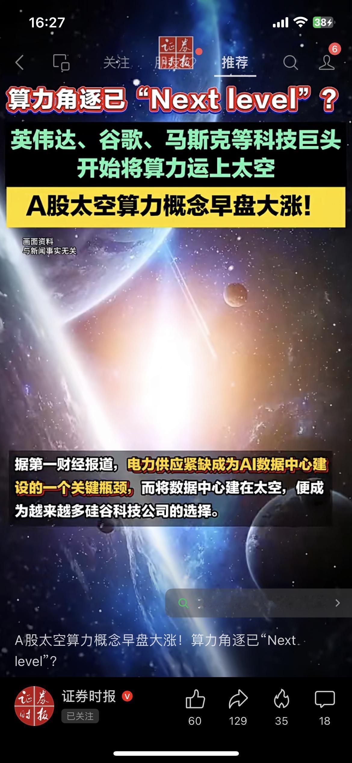 算力卷到外太空!英伟达GPU装卫星,A股概念股直接涨停》 现在的科技巨头是真敢玩——算力直接往太空搬! • 英伟达H100 GPU要装卫星送太空,这是先进数据中心GPU第一次上天; • 谷歌搞“太阳捕手”计划,要在太空建机器学习系统,薅够太阳能; • 马斯克靠Starlink搞太空机房,贝索斯放话10年建吉瓦级太空数据中心! 今天A股直接炸了:上海港湾涨停,四川金顶连板,航天宏图跟着涨——这波“太空基建”是要成下一个万亿赛道?你们觉得这波能上车吗? 太空算力 英伟达H100