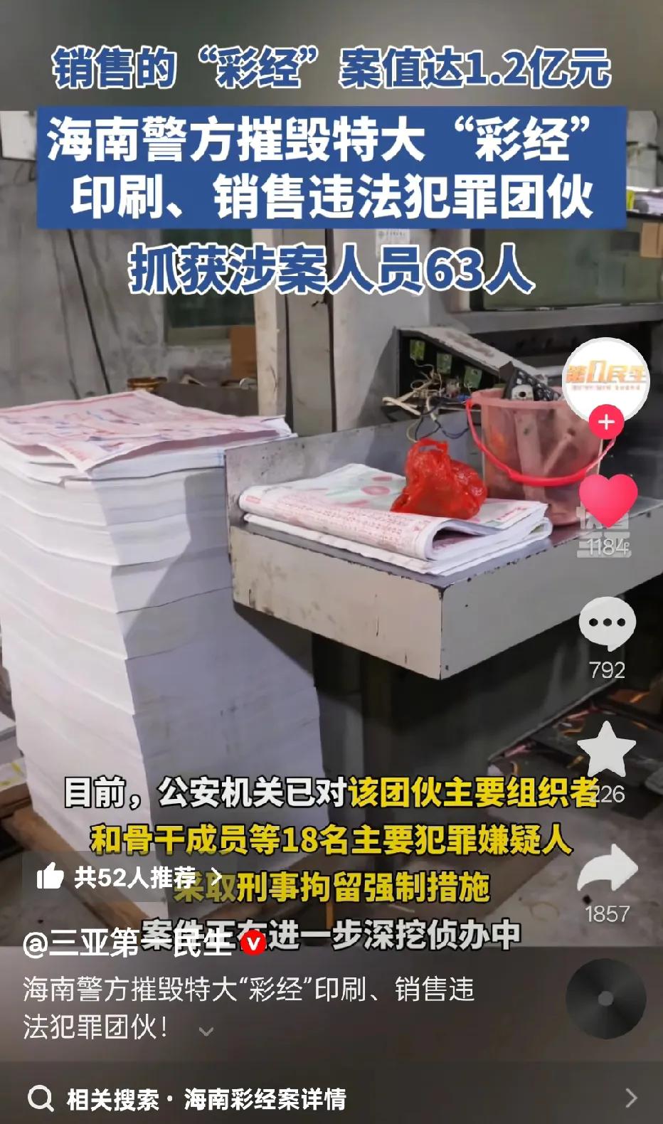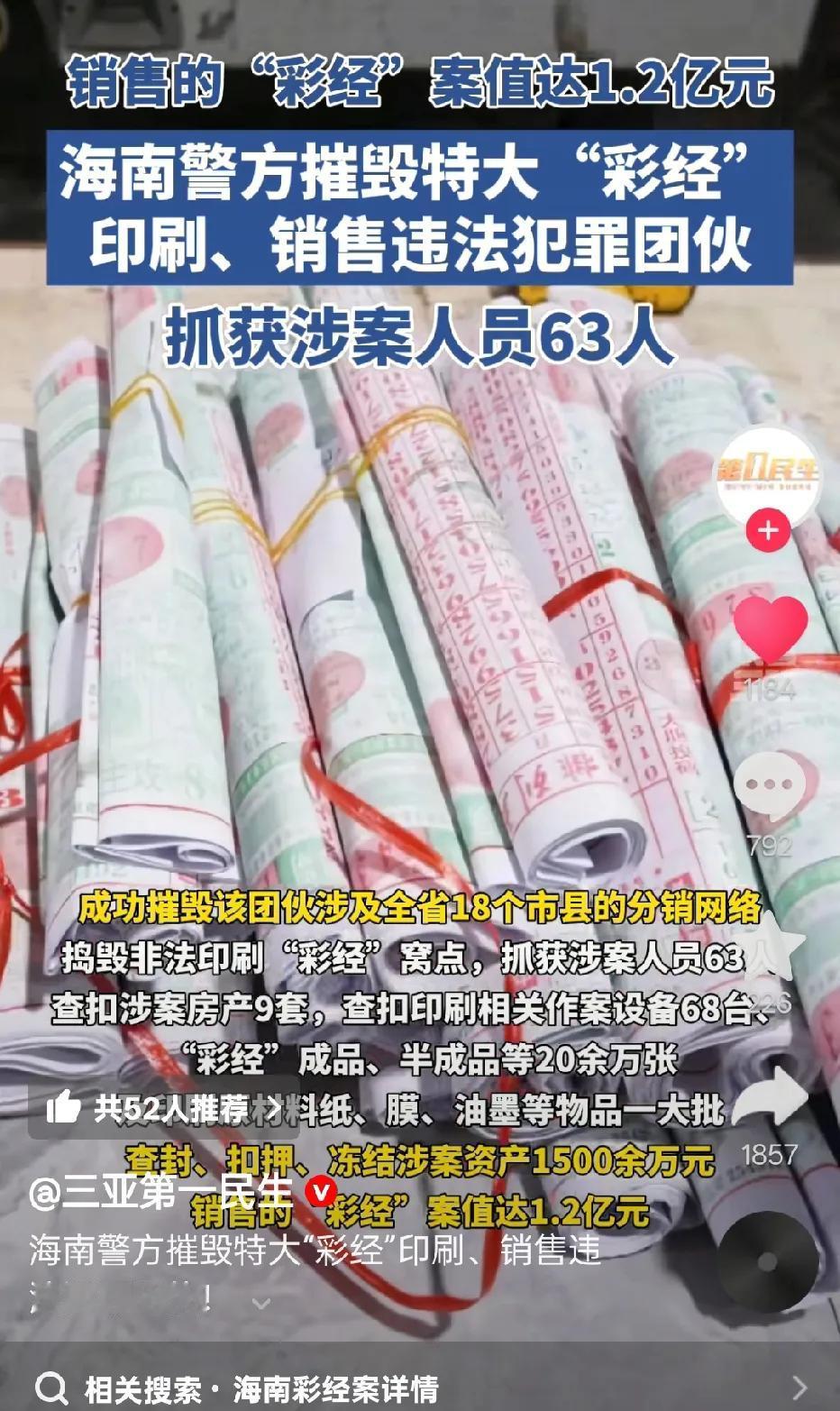 第一次听说这个东西叫“彩经”,看新闻里说,这次海南抓获的涉案人员就有六十三人!这么多人啊。而销售的那些“彩经”的案值竟然高达1.2亿元,这个“彩经”的东西是做什么的? 看到新闻里“彩经“的画面,发现“彩经”有很多数字印刷在上面,搞不懂这些数字是干什么用的,看的眼花缭乱!直到看到评论才知道,这个以前是“打奖”的?但是我们要遵纪守法,不让弄的东西千万不要去触碰!大家说对吗?