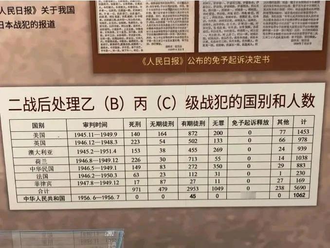 知乎里有人问:“我们能不能原谅日本?”有位网友用一张表格,对此做了回答。 我当初怀疑,是不是网友胡编乱造,仔细查了一下,这张表格确有其事,丝毫不假。 由最高人民检察院举办的《正义之剑——新中国检察机关侦查起诉日本战犯》主题展览中,就有这个统计表格。 表格中,记录了二战结束后,世界各国处理轴心国战犯的数据。 国民党蒋介石统治的中华民国时期,总共对2435名日本战犯进行了审判,经核定判处死刑的,有149人,包括南京大屠杀主犯谷寿夫、“百人斩”凶手向井敏明、野田毅等等。最终实际执行的只有145人,另外4人,在执行前病死或减刑。最令人感到遗憾的是,侵略头子冈村宁次竟然被无罪释放。 新中国成立后,中华人民共和国政府又于1950年,从苏联接收了969名日本战犯,加上在此前的解放战争中俘虏了一些日本战犯。为解决历史遗留问题,维护司法主权与历史正义,揭露侵略本质,清算战争罪行,中华人民共和国政府于1956年,再次对日本战犯进行审判。 然而,当时中日民间友好关系已经开始出现萌芽,而且多数战犯经过改造,已经有了悔罪表现,于是在审判过程中,采取“惩办与宽大结合”的原则。最终,只有45人判刑,其余1017人全部免于起诉,予以释放。 甚至,为了表示中国人以德报怨的优良传统,还主动放弃了日本的战争赔偿。 回顾这段历史,对照当今日本右翼势力又在蠢蠢欲动的现实,当时做的对还是不对,相信每位读者的心中,都有了清晰的答案。 日本历史罪责 日本侵华历史 日本侵华内幕 日本侵华证据