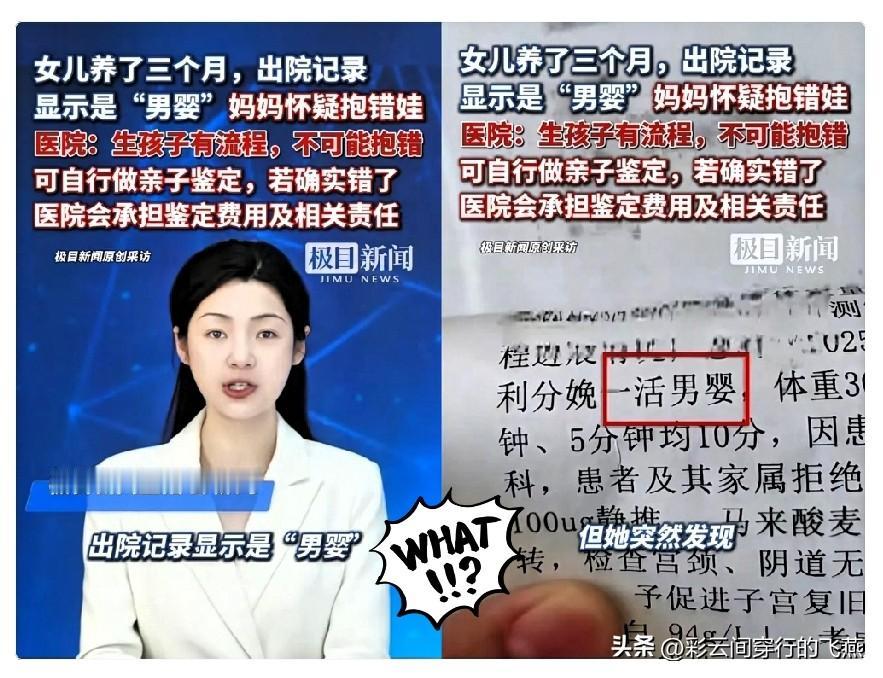 养了三个月的闺女, 出院记录竟写着“男婴”? 海口这女子怀疑自己孩子抱错了。医院却 一句“笔误”就想翻篇,可这哪是简单打错字的事儿。 评论区瞬间炸了,有人急着支招:赶紧做亲子鉴定!早做早安心,别天天揪着心过日子。 也有人吐槽医院:性别是跟孩子一辈子的事,一句改改就好也太敷衍了! 医院说有核对流程,可真严谨的话,性别能写错? 之前还有类似的医疗文书出错案例,可见不是偶然。 这错字戳中的是家长的心病——孩子是心头肉,容不得半点马虎。 你觉得医院光让改记录、承诺承担鉴定费就够了吗?要是你遇到这种事,会第一时间做亲子鉴定吗?