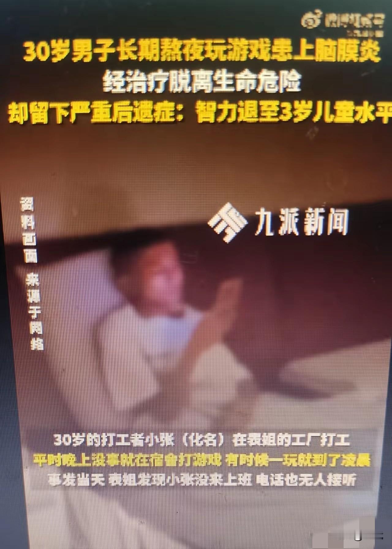 浙江宁波一名打工者,长期在宿舍熬夜打游戏、刷手机,某天突然昏迷,送医后确诊为“病毒性脑膜炎伴脑炎”。虽经治疗出院,却留下了严重后遗症:智力退化至3岁儿童水平,言语困难、肢体迟钝,生活完全无法自理。 熬夜本身不会直接引发脑膜炎,但长期熬夜会扰乱人体生物钟,导致免疫力大幅下降。当免疫系统功能减弱时,病毒更易侵入神经系统,诱发脑膜炎等疾病。同时,熬夜还会造成神经系统紊乱,增加心脑血管疾病风险,如头晕、记忆力减退,甚至更严重的健康危机。 这名打工者的悲剧,正是长期熬夜危害的缩影。在快节奏生活中,许多人将熬夜视为“习惯”,却忽视了它背后隐藏的健康代价。每一次深夜的屏幕亮光,都在透支身体的防御能力;每一次凌晨的清醒,都在累积疾病的隐患。 健康是人生最宝贵的财富,而熬夜无异于慢性自毁。从今天起,让我们告别熬夜,规律作息,守护身体机能。只有充足的睡眠,才能为生命注入持久的活力,避免重蹈覆辙。