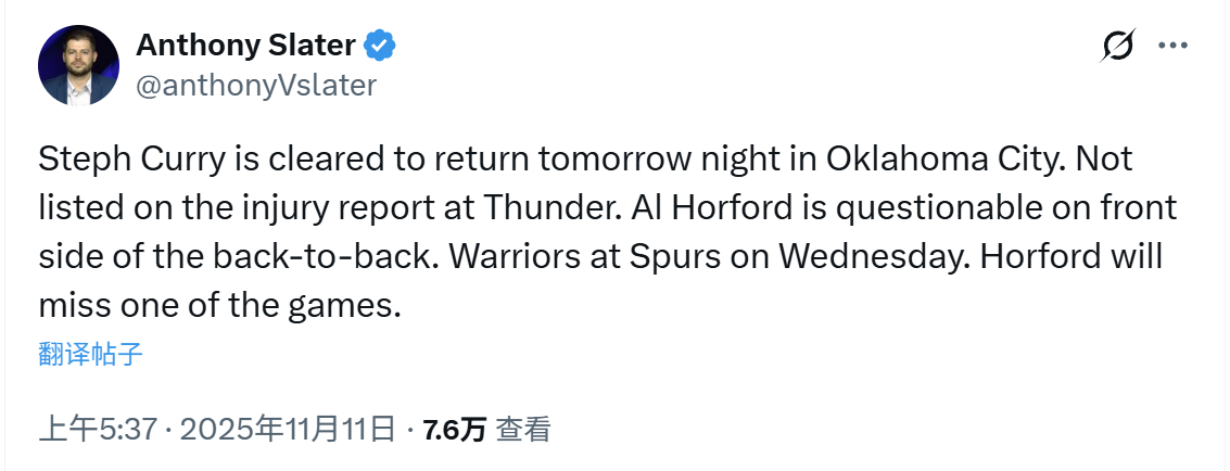 勇士那边,库里因病缺席三场后复出,由于是背靠背第一场,不打背靠背的霍福德出战成疑。