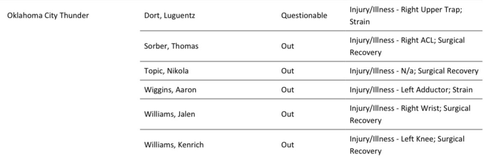 雷霆明天主场迎战勇士,多尔特右上斜方肌拉伤出战成疑,杰伦·威廉姆斯、阿隆·威金斯、肯里奇·威廉姆斯、托皮奇、索贝尔因伤缺阵。