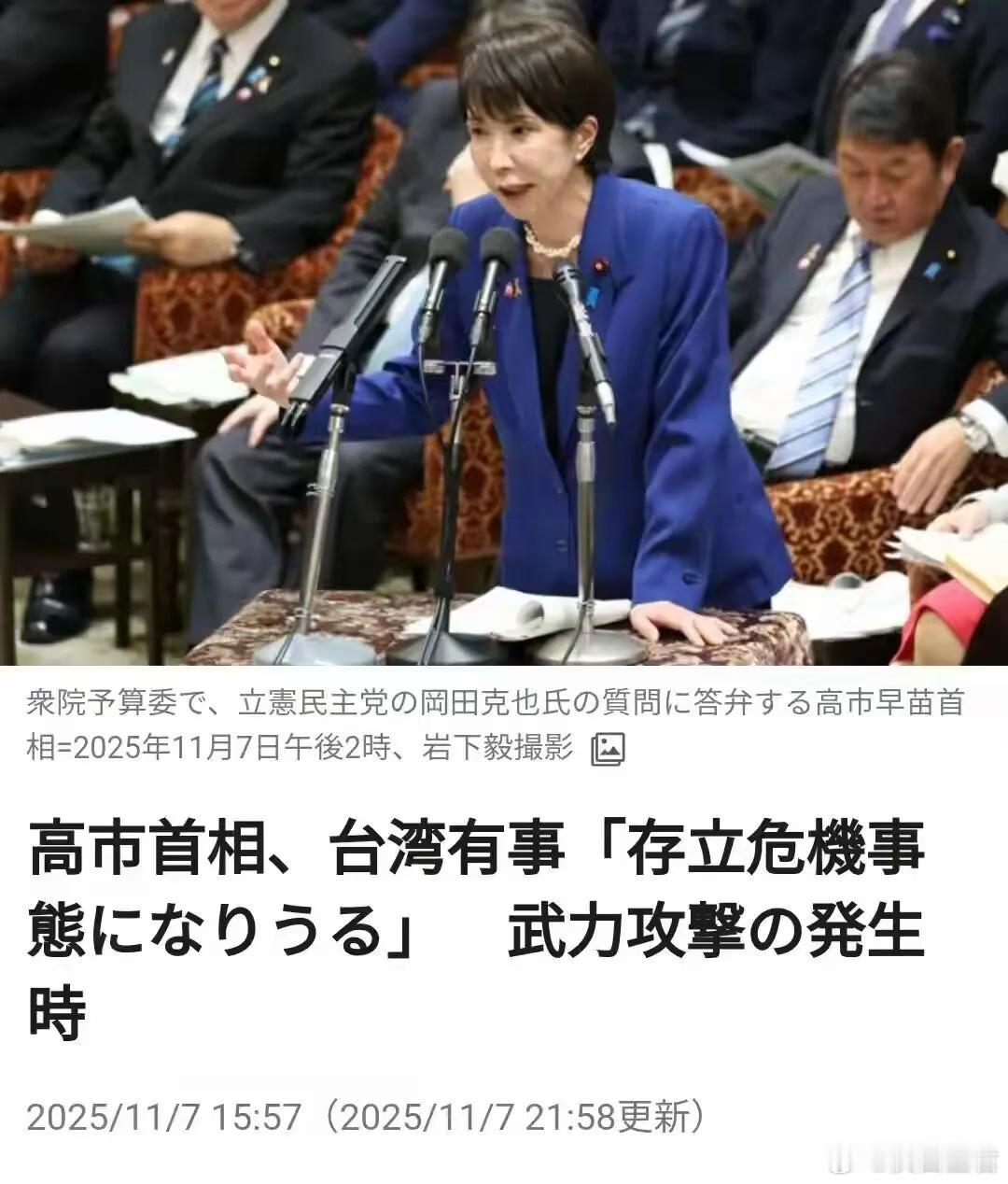 可高市早苗倒好,直接来了个“王炸”——她把“台湾有事”和日本的“存亡危机事态”绑一块儿,这啥意思?