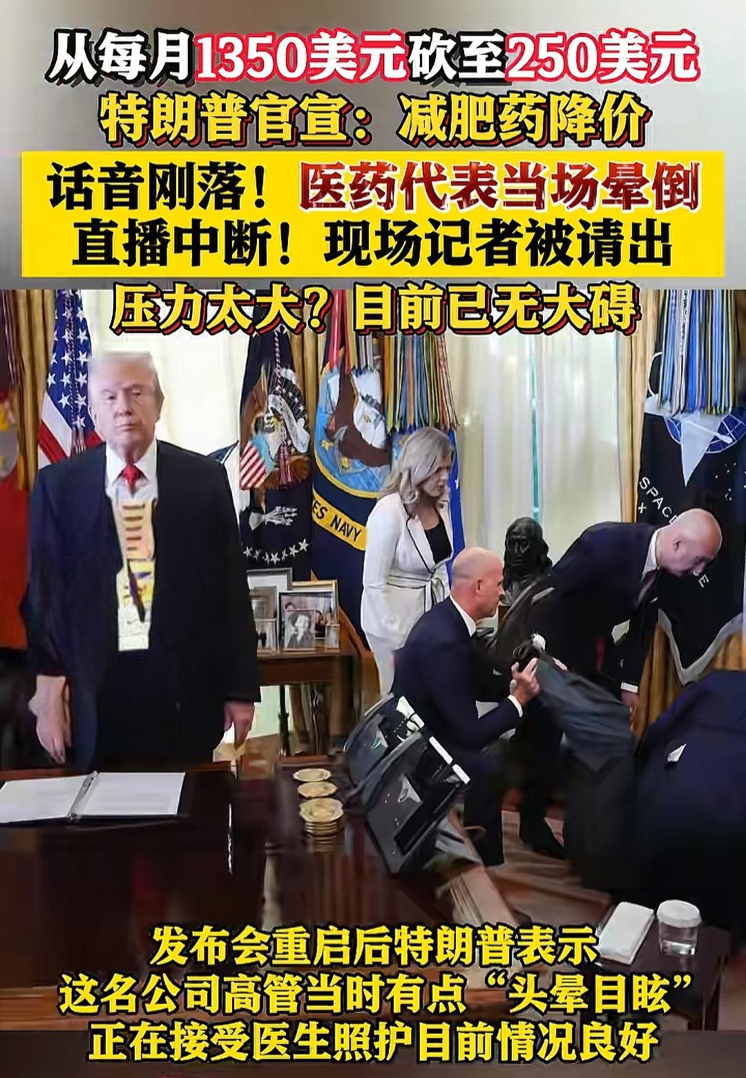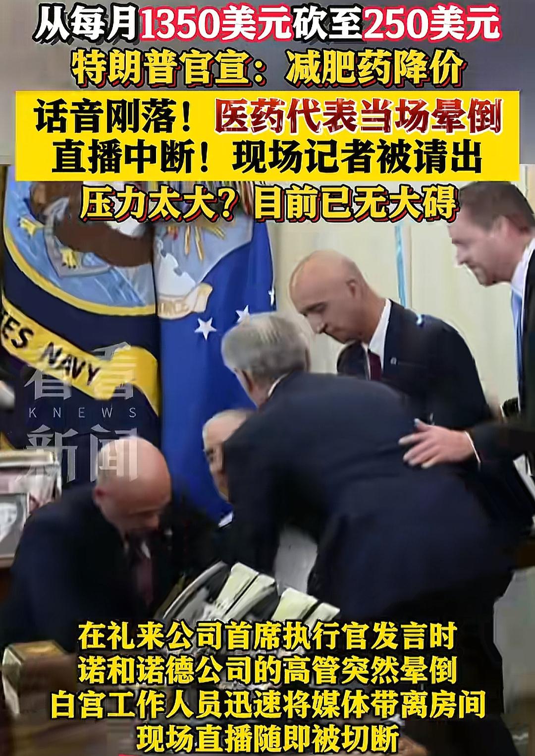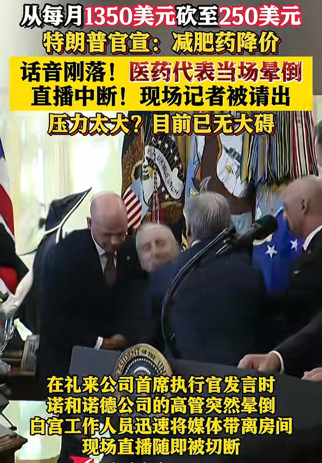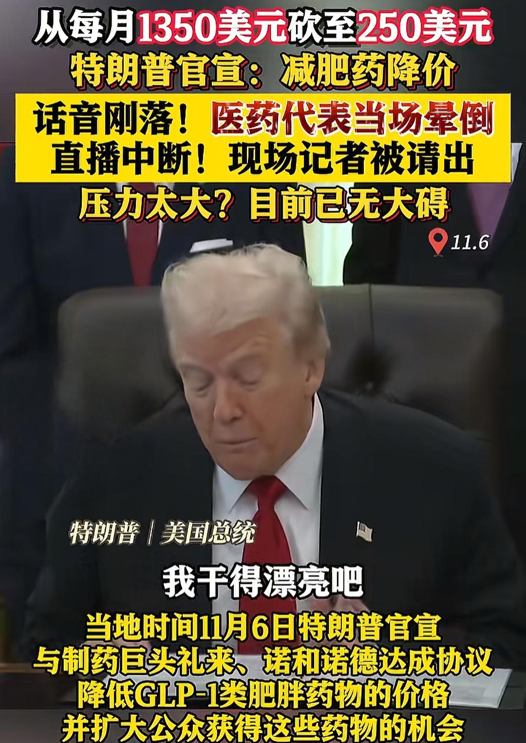 干得漂亮! 特朗普话音刚落, 他当场晕倒…… 当地时间11月6日,白宫里可真热闹。 特朗普对着镜头宣布,把那网红减肥药价格从1350美元砍到245美元,还让医保首次给肥胖症买单,符合条件的人每月自付才50块! 并且特朗普,还洋洋自得地说了一句“我干得漂亮吧!” 这话刚说完,台下诺和诺德的高管,就直挺挺晕倒了,网友调侃:“这是被降价吓晕,还是心疼利润哭晕?” 说真的,这药之前贵得没天理。 明明美国快一半人都肥胖,低收入群体患病率更高,可这药每月上千美元,普通人家哪儿吃得起?! 之前只有少数有钱人能当“减肥神器”,低收入者只能看着,难怪被骂“富人专属药”。 药企倒赚得盆满钵满,诺和诺德光这药,去年在美国就卖了百多亿美元,涨价时说看市场行情,降价时就“扛不住”了。 特朗普这波操作,确实够直接,相当于给药价打了一折多。 但说白了也是互相算计:药企看似亏了,实则换来了医保覆盖的670万潜在用户,还能免三年关税,典型的“以价换量”。 就像礼来CEO说的,销量涨了,利润就补回来了,算盘打得比谁都精。 不过这戏码也挺讽刺。 美国药价本来就是全球最贵的,比其他国家贵三倍多,全靠药企和中间商层层加价割韭菜。 之前特朗普也签过降药价行政令,结果要么被法院叫停,要么落地打折扣,这次能不能成,还真不好说。 分析师早就说了,这政策更像“纸面宣言”,真要执行还得看药企愿不愿意配合。 那位晕倒的高管也挺有意思,或许是演得太投入,或许是真疼钱。 毕竟之前药企说涨价就涨价,理由要么是通胀,要么是研发成本,可谁都知道,美国市场的高利润早就让他们赚翻了。 现在被按下降价键,不过是少赚点,至于这么激动吗? 说到底,这事儿看着大快人心,其实还是利益博弈。 老百姓盼着药价真降,药企想着怎么少亏多赚,政府则想赚选票。 希望这次不是昙花一现,别等热度过了,药价又偷偷涨回去,让晕倒的戏码白演一场。 毕竟对那些吃不起药的肥胖人群来说,实打实的低价,可比戏剧性的晕倒有用多了。 上联: 岁岁风调雨顺,请赐下联